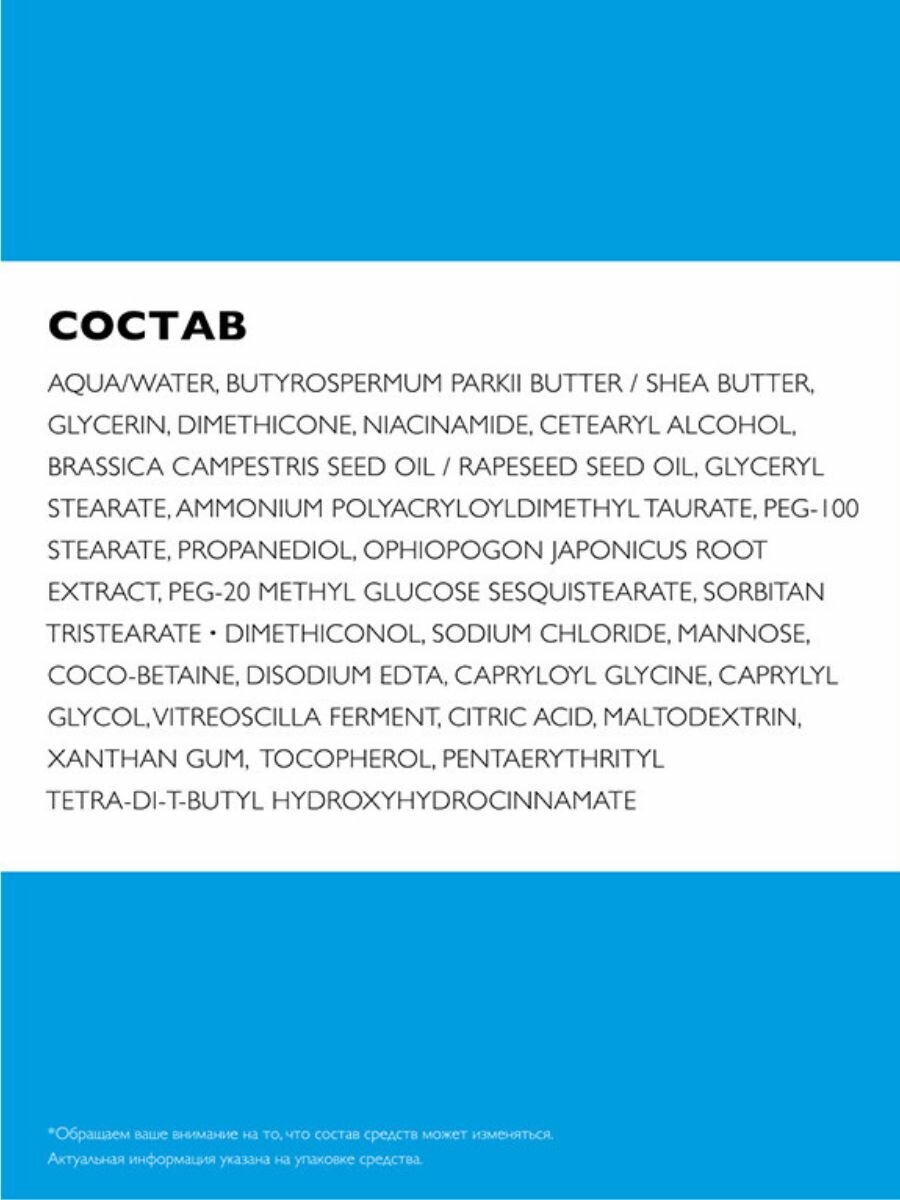 | Состав | aqua/water, butyrospermum parkii butter / shea butter, glycerin, dimethicone, niacinamide, cetearyl alcohol, brassica campestris seed oil / rapeseed seed oil, glyceryl stearate, ammonium polyacryloyldimethyl taurate, peg-100 stearate, propanediol, ophiopogon japonicus root extract, peg-20 methyl glucose sesquistearate, sorbitan tristearate, dimethiconol, sodium chloride, mannose, coco-betaine, disodium edta, capryloyl glycine, caprylyl glycol, vitreoscilla ferment, citric acid, maltodextrin, xanthan gum, tocopherol, pentaerythrityl tetra-di-t-butyl hydroxyhydrocinnamate, (code f.i.l.:b237057/1) |