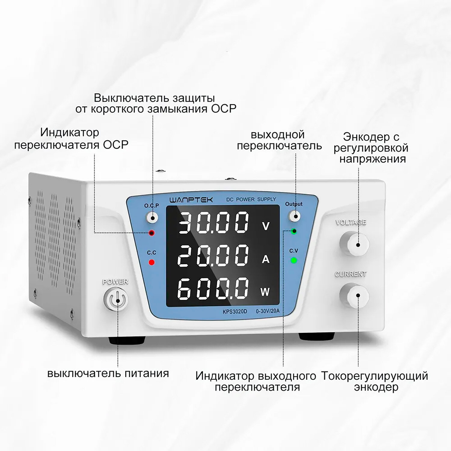 Лабораторный блок питания Wanptek KPS3020D (30B, 20A) представляет собой источник тока с высокой точностью и стабильностью, который подходит для лаборатории и других сфер, где требуется надежное и безопасное электропитание с помощью постоянного тока. Источник постоянного тока оснащен цифровым дисплеем, на котором отображаются текущие значения напряжения и тока, а также индикаторами работы и ошибок.