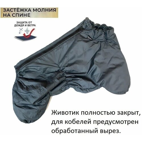 Дождевик защитит шерсть животного от дождя и грязи, а непродуваемая ткань - от сильного ветра. Комбинезон надежно фиксируется при помощи молнии на спине, для удобства надевания на шее есть кнопка, а на штанинах предусмотрены удобные резинки, препятствующие попаданию грязи и влаги снизу. Комбинезон является универсальным и подходит как для суки, так и для кобеля (необходимо вырезать на нижней части комбинезона область, обработанную машинной строчкой). Размер: спина 58см, грудь 98см, шея 50см. Длина изделия с воротником 63см.