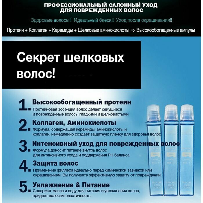 | Инструкция по применению | смешайте содержимое ампулы с холодной водой в пропорции 1:1 до кремообразного состояния, нанесите на чистые, практически сухие волосы, распределите по всей длине, особое внимание уделяя секущимся кончикам и поврежденным участкам. Не наносите на кожу головы. Для усиления эффекта наденьте термо-шапку или оберните волосы полотенцем. Время воздействия 10-20 минут. По истечении времени смойте филлер теплой водой без использования шампуня. Возможно также нанесение на волосы без предварительного смешивания с водой и использование состава совместно с химическими продуктами при окрашивании или других процедурах для защиты волос от повреждений |