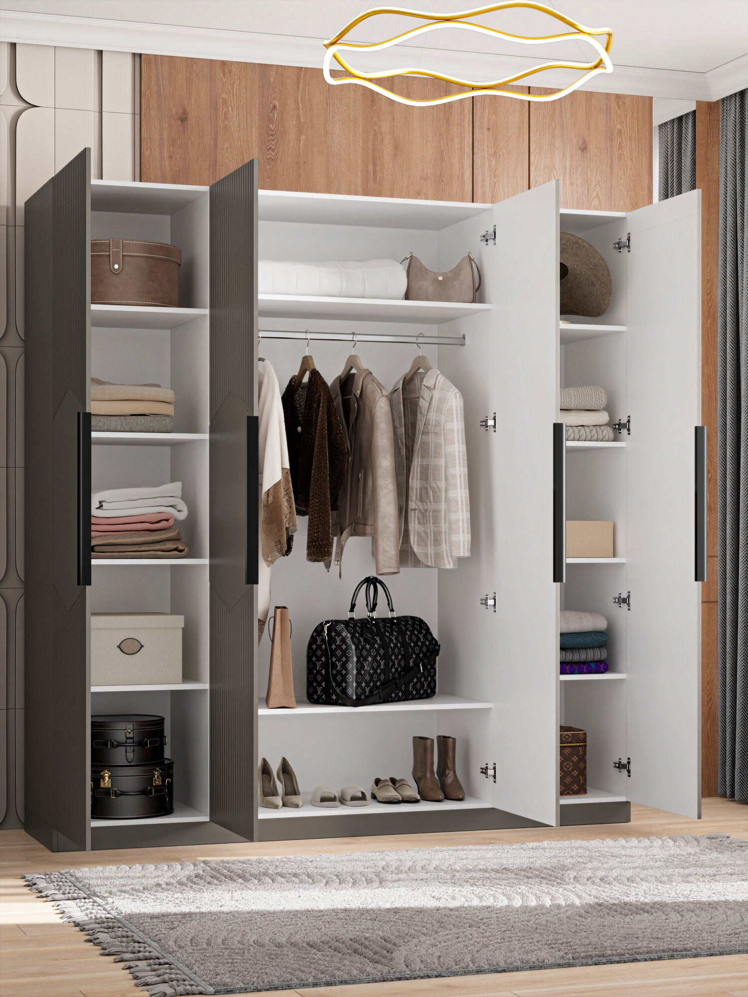 LAERA Шкаф для одежды четырехдверный распашной с полками сити риолит: сравнение цен, характеристики, фото, актуальное наличие и цены.