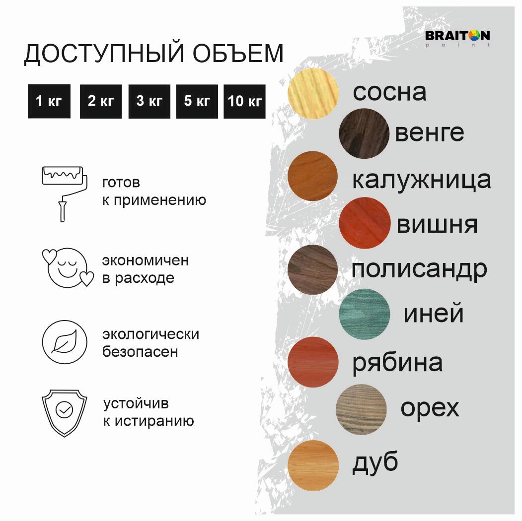Колеровка: колеруются в цвета каталога светлый дуб, сосна, калужница, венге, орех, палисандр, иней, вишня, рябина. Применяется для получения декоративного лессирующего эффекта.