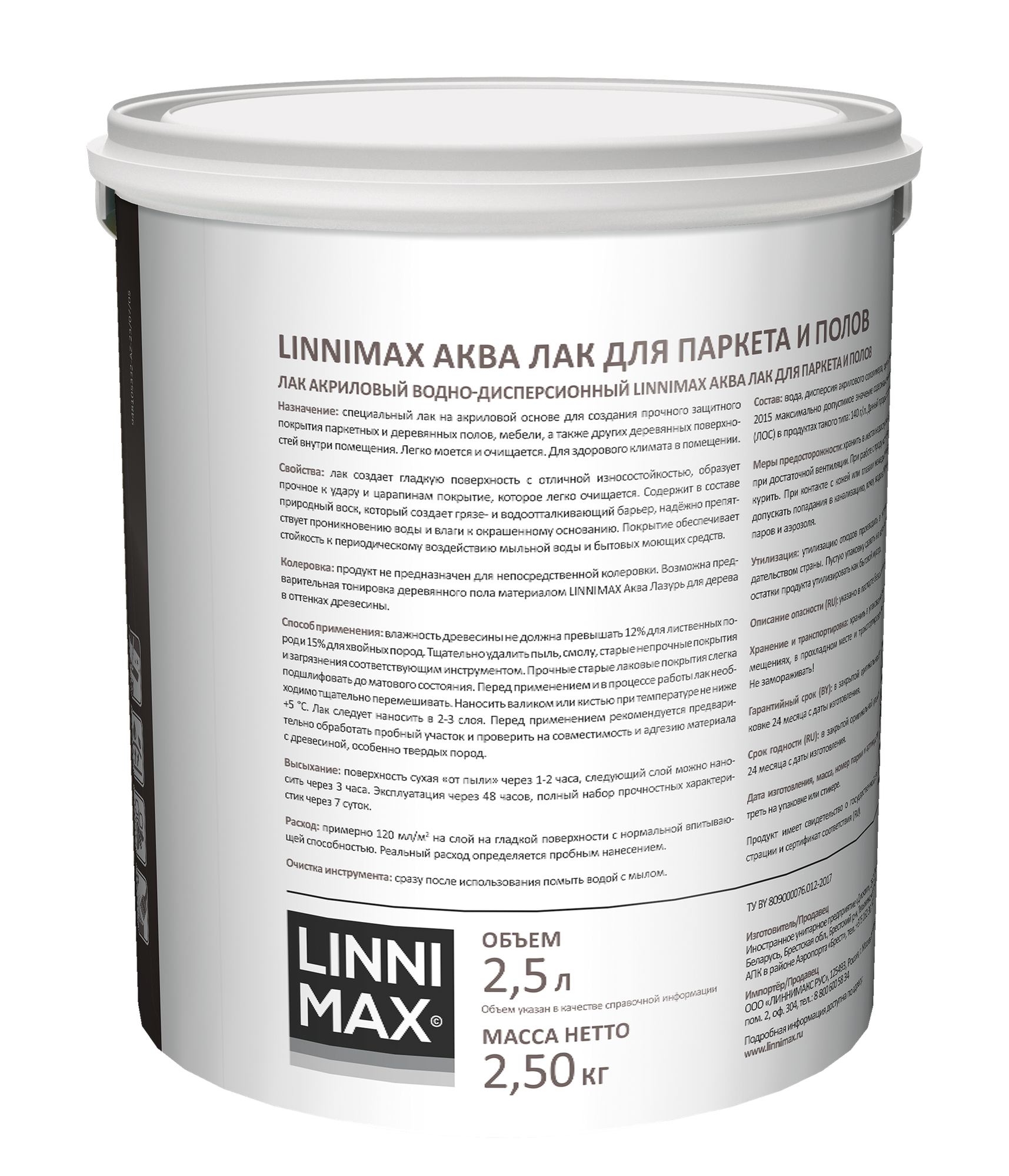 Назначение: Специальный прозрачный запечатывающий лак на акриловой основе для создания прочного защитного покрытия паркетных и деревянных полов, мебели, а также других деревянных поверхностей внутри помещения. Создает гладкую поверхность с отличной износостойкостью и образует прочное к удару и царапинам покрытие. Покрытие легко очищается мыльной водой или бытовыми моющими средствами, обеспечивает стойкость к статическому воздействию воды и бытовым моющим средствам. Область применения: Предназначен для жилых и частных помещений с умеренной пешеходной нагрузкой. Для лакирования нагружаемых пешеходной нагрузкой поверхностей из древесины (паркет, деревянные полы, лестницы, OSB-плиты, напольные пробковые покрытия), а также для придания износостойкости другим деревянным поверхностям. Подходит для нанесения запечатывающего покрытия на поверхности, покрытые лаками, эмалями и лазурями внутри помещений. Свойства: для внутренних работ; эластичный, не отслаивается и не растрескивается при деформациях древесины; экологичный, практически без запаха во время нанесения и высыхания, без растворителей и вредных здоровью добавок; образует прозрачное покрытие, не желтеет, не темнеет со временем, не меняет цвет древесины, подходит для запечатывания белых и светлых покрытий; содержит в составе природный воск, для придания покрытию грязе- и водоотталкивающих свойств; устойчив к бытовым чистящим средствам, выдерживает регулярную влажную очистку деревянных полов с применением мягких моющих средств; хорошая заполняющая способность, нанесение без шагрени и полос на больших площадях; быстро высыхает, возможно послойное нанесения в течение одного дня. Подготовка поверхности: Основание должно быть чистым, обладающим несущей способностью и свободным от разделяющих веществ (пыль, смола, масла, старые непрочные покрытия, рыхлая ржавчина и загрязнения). Перед проведением лакокрасочных работ должна быть измерена влажность древесины. Влажность должна быть измерена в нескольких местах на глубину мин. 5 мм. Для хвойных пород допускается максимальная влажность 15%, для лиственных 12% макс. Перед применением рекомендуется предварительно обработать пробный участок и проверить на совместимость и адгезию материала с подложкой. Нанесение продукта: Аква Лак для паркета и полов можно наносить кистью, щеткой для нанесения запечатывающих покрытий или валиком. Перед применением тщательно перемешать и при необходимости для нанесения грунтовочного/промежуточного покрытия разбавить максимум 5-10 об.% воды. В жидком состоянии и при нанесении лак имеет молочный оттенок, однако в высохшем состоянии он практически бесцветный. Лак рекомендуется наносить в 2-3 слоя. Колеровка: Цвет продукта - бесцветный. Продукт не предназначен для непосредственной колеровки. Условия транспортировки и хранения: Хранить в упакованном виде в закрытых складских помещениях, в прохладном месте при температуре не ниже +5°С. Срок годности 24 месяца с даты изготовления.