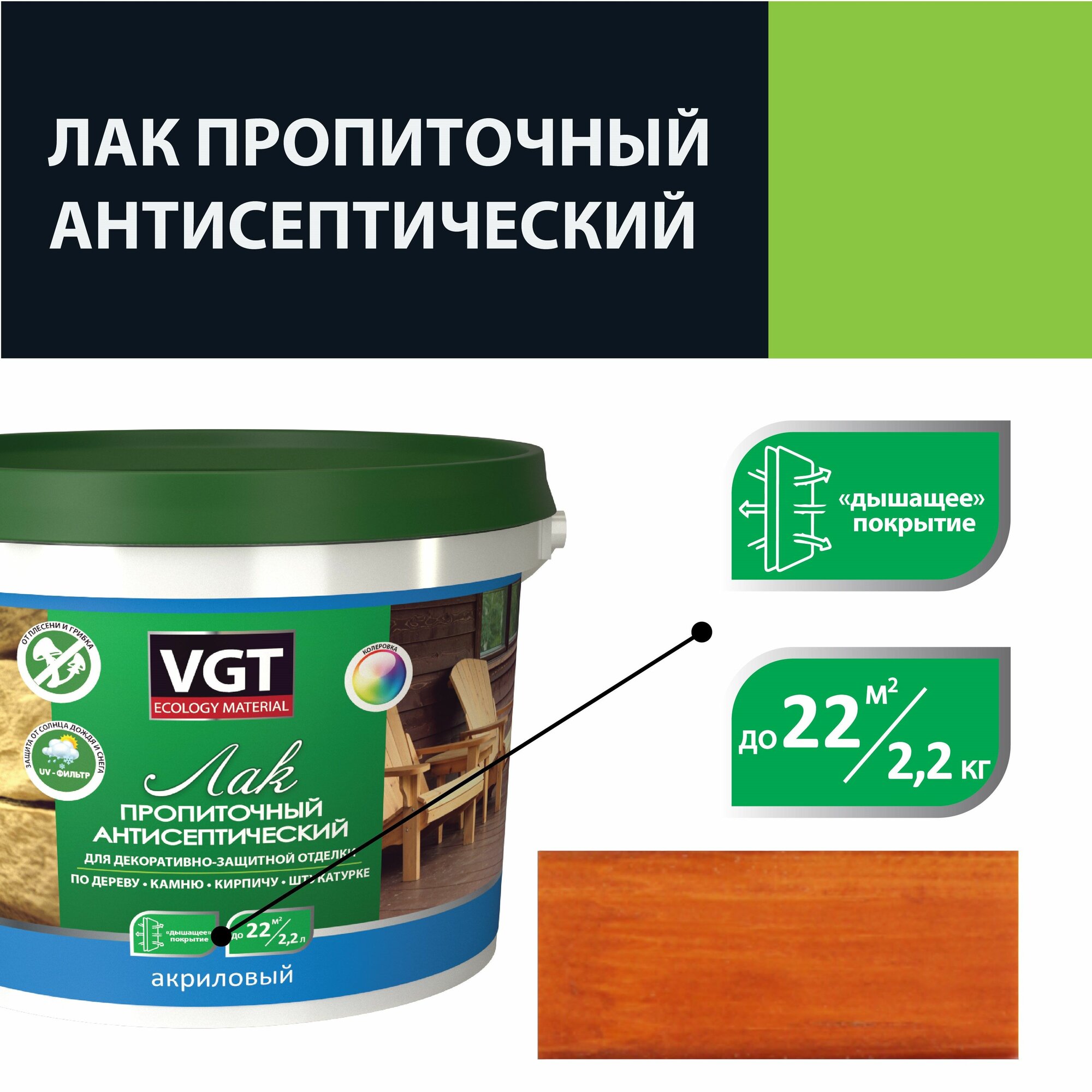 - лак антисептик ВГТ отлично пропускает пар, не позволяя влаге задерживаться в волокнах