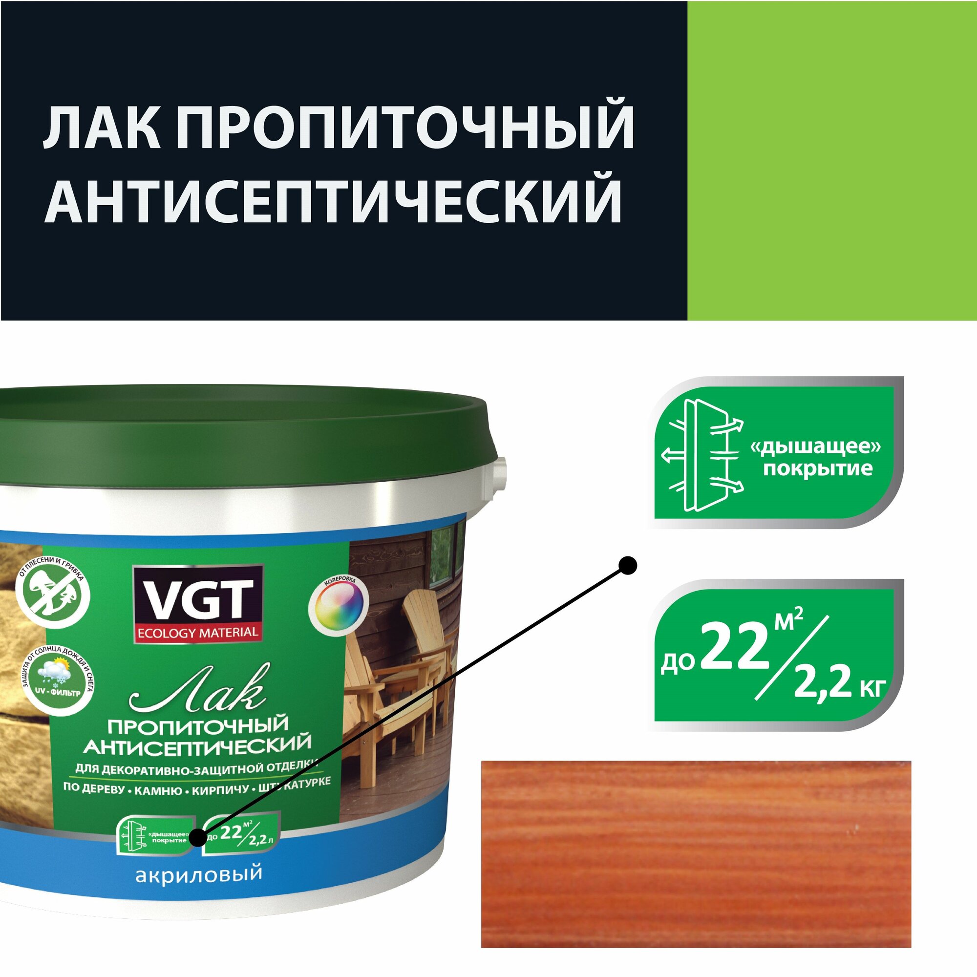 - лак антисептик ВГТ отлично пропускает пар, не позволяя влаге задерживаться в волокнах