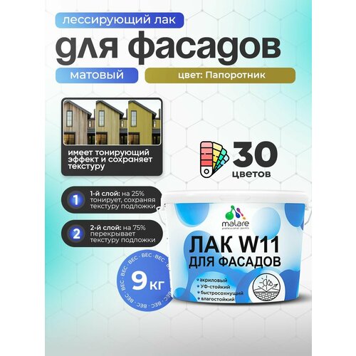 Лак колерованный тонирующий фасадный Malare W11 для защиты фасадов зданий, для дерева, камня и кирпича, быстросохнущий влагостойкий экологичный, матовый, папоротник, 9 кг.: сравнение цен, характеристики, фото, актуальное наличие и цены.