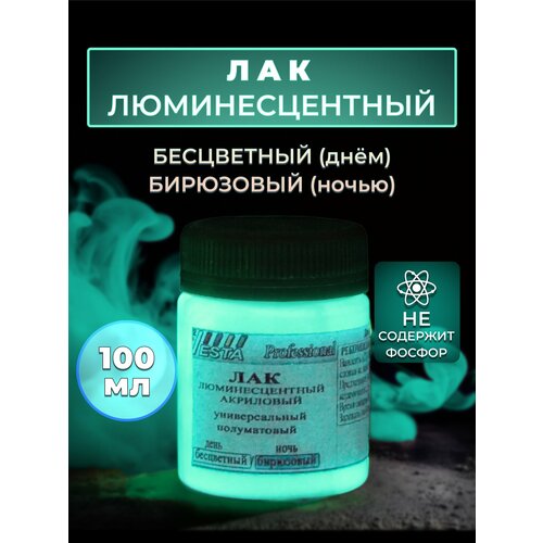 Лак акриловый "VESTA Профессионал" в полной темноте имеет бирюзовое свечение. При обычном дневном освещении лак бесцветный, полупрозрачный.
