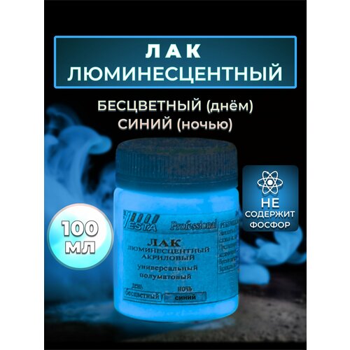 Лак акриловый "VESTA Профессионал" в полной темноте имеет бирюзовое свечение. При обычном дневном освещении лак бесцветный, полупрозрачный.