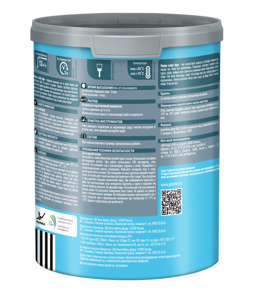 Лак Pinotex LACKER Aqua 70 глянц 1л Pinotex Lacker Aqua Колеруемый декоративно-защитный лак на водной основе для внутренних работ. Образует эластичное покрытие, устойчивое к ударам, царапинам, а также воздействию воды, грязи, жира и бытовой химии. Лак удобен в нанесении, легко разравнивается и не оставляет следов от инструмента при нанесении. Придает поверхности отличный декоративный вид, подчеркивая естественную структуру древесины. Быстро высыхает на окрашенной поверхности, окрасочные работы можно провести за 1 день. Лак одобрен для покраски детской мебели и игрушек, а также сертифицирован для лакирования деревянной посуды, безопасен при контакте с пищевыми продуктами. Придает поверхности грязе- и водооттакливающие свойства. Выдерживает воздействие моющих средств. Поверхность устойчива к ударам и царапинам. Эластичное покрытие, не растрескивается. Не желтеет и не темнеет со временем, не изменяет естественный цвет древесины. Широкая палитра колеровки – 44 оттенка Технические характеристики Разбавитель: Вода Время высыхания: До нанесения следующего слоя 2ч. Полное высыхание 4ч. Расход в 1 слой: До 13 м²/л Степень блеска: Матовый (10) Глянцевый (70) Инструменты: Кисть Рекомендованное кол-во слоев: 2-3 слоя Цветовая палитра: CLR (база под колеровку) Используется в качестве самостоятельного бесцветного лака и в качестве базы под колеровку. Срок годности: 3 года при температуре от +5°С до +30°С Упаковка: 1L, 2,7L Область применения Продукт можно использовать для следующих поверхностей: деревянные стены / деревянные потолки / двери / перила / карнизы / детская мебель / деревянные игрушки / деревянные столы / деревянная посуда