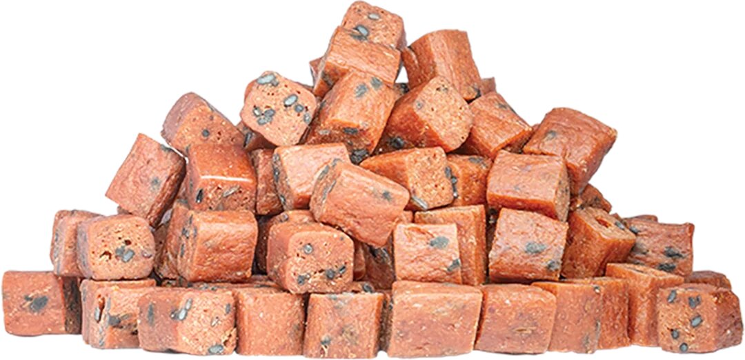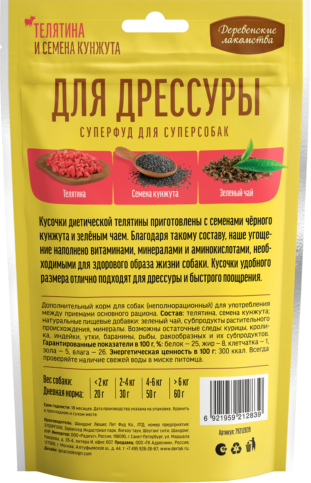 Наше новое лакомство создано специально для дрессуры собак. Кусочки телятины здесь обогащены семенами кунжута и зеленым чаем. Это лакомство богато витаминами, минералами и аминокислотами, необходимыми для хорошего здоровья собаки. Состав: телятина, семена кунжута, натуральные пищевые добавки: зеленый чай, субпродукты растительного происхождения, минералы. Возможны остаточные следы курицы, кролика, индейки, утки, баранины, рыбы, ракообразных и их субпродуктов.