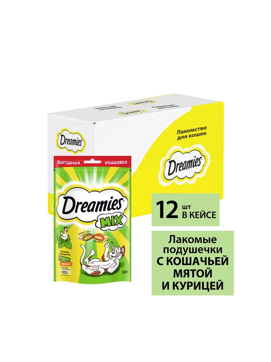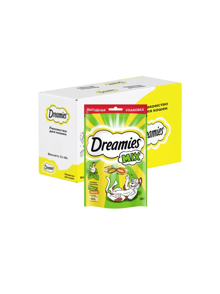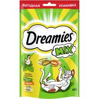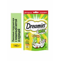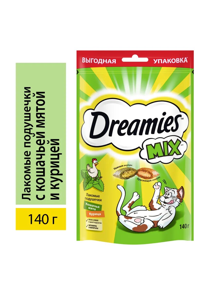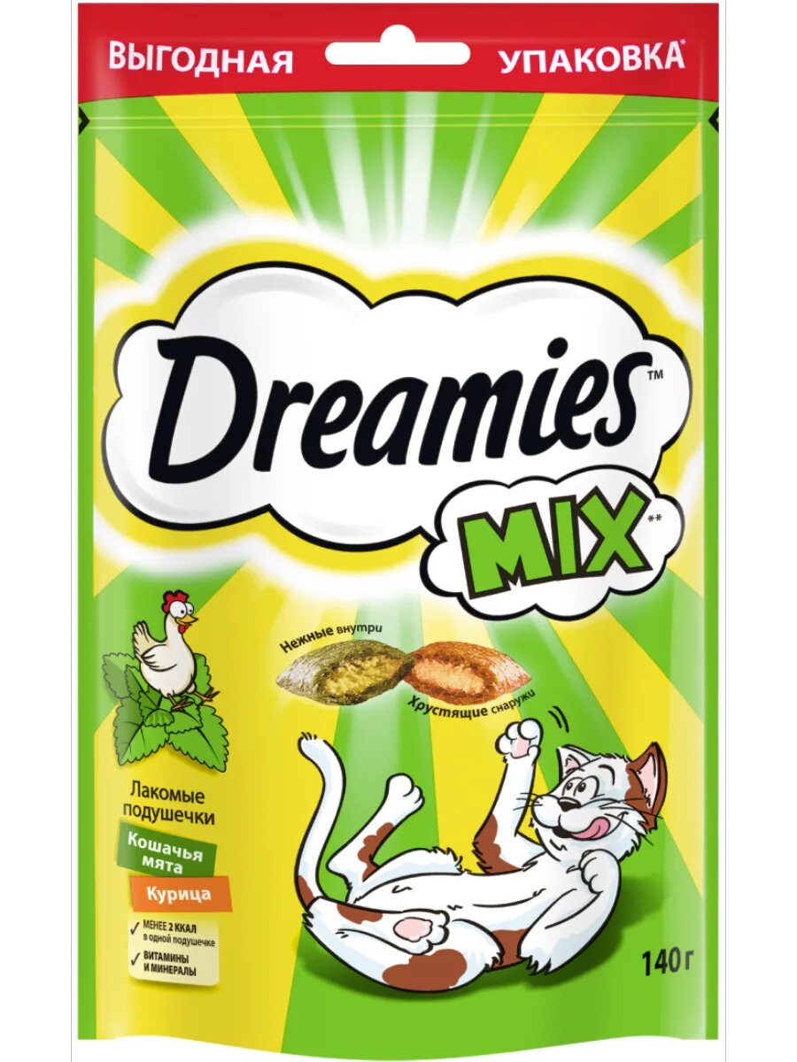 Лакомство Dreamies MIX для взрослых кошек, с мятой и курицей, 140г. ЛакомствоDREAMIESMIX кошачья мята и курица - это яркое сочетание любимых вкусов вашего питомца! Любимая всеми котиками кошачья мята в сочетании с аппетитной курочкой точно не оставит равнодушным вашего любимца. ЛакомствоDREAMIESприносит не только радость, но и пользу вашему питомцу, ведь в каждой хрустящей подушечке с нежным паштетом внутри содержится всего 2 килокалории, а также все необходимые витамины и минералы. Ни один кот не сможет устоять перед хрустящими подушечкамиDREAMIESMIX с кошачьей мятой и курицей! Состав: продукты растительного происхождения, животные жиры и растительные масла (в том числе подсолнечное масло), продукты животного происхождения (в том числе из курицы), гидролизат куриного белка, минеральные вещества, пивные дрожжи, красители, аминокислоты (в том числе таурин), сухая кошачья мята, витамины, антиоксиданты. Содержание питательных веществ (100 г): белок – 31 г; жир – 21 г; зола – 7 г; клетчатка – 1,0 г; влага – 10 г; витамин А – не менее 780 МЕ; витамин Е – не менее 6,5 мг. Энергетическая ценность (100 г): 412 ккал / 1725 кДж. Лакомство DREAMIES – это дополнение к ежедневному рациону. Давайте вашему любимцу лакомые подушечки DREAMIES, когда хотите побаловать его. Рекомендуется не более 15 подушечек в день. Не забывайте, что миска с водой всегда должна стоять в доступном для кошки месте. Вскрытую упаковку хранить не более 4 недель. Хранить при температуре от +4 до +35°С и относительной влажности воздуха не более 75%. Вскрытую упаковку хранить не более 4 недель.