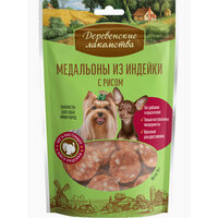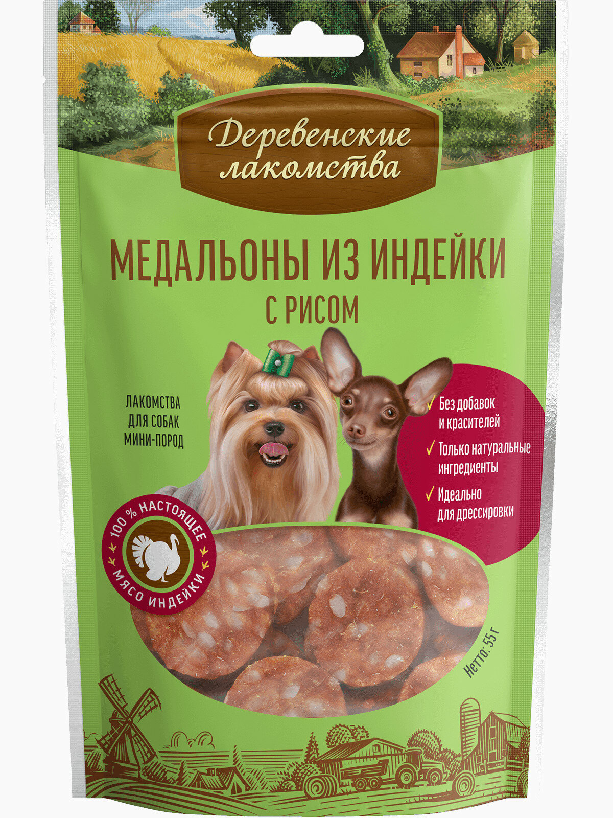 Лакомство для собак мини-пород «Деревенские лакомства» Медальоны из индейки с рисом, 55 гр. х10 шт.: сравнение цен, характеристики, фото, актуальное наличие и цены.