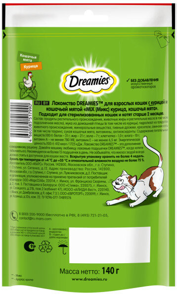 | Состав | Злаки и продукты их переработки, белковые растительные экстракты, мука животного происхождения (в том числе мука из курицы минимум 4%), животные жиры и растительное масло, гидролизат животного происхождения, витамины и минералы, зелень (в том числе сухая кошачья мята) |