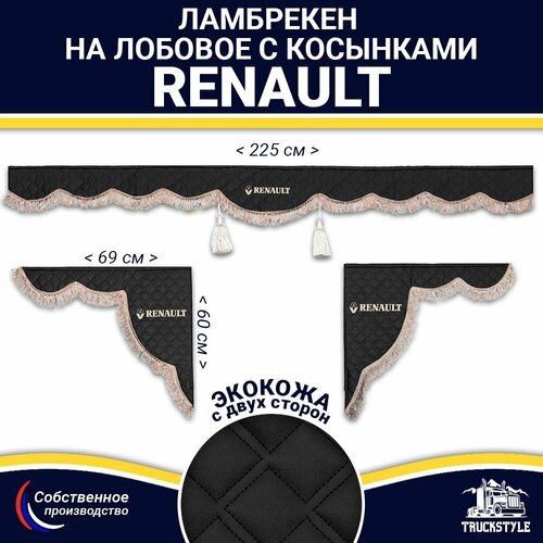Ламбрекен с косынками двусторонний на лобовое RENAULT. Черный цвет с коричневыми кисточками. Ткань экокожа (лицо, изнанка). Аксессуар для грузовика Рено
