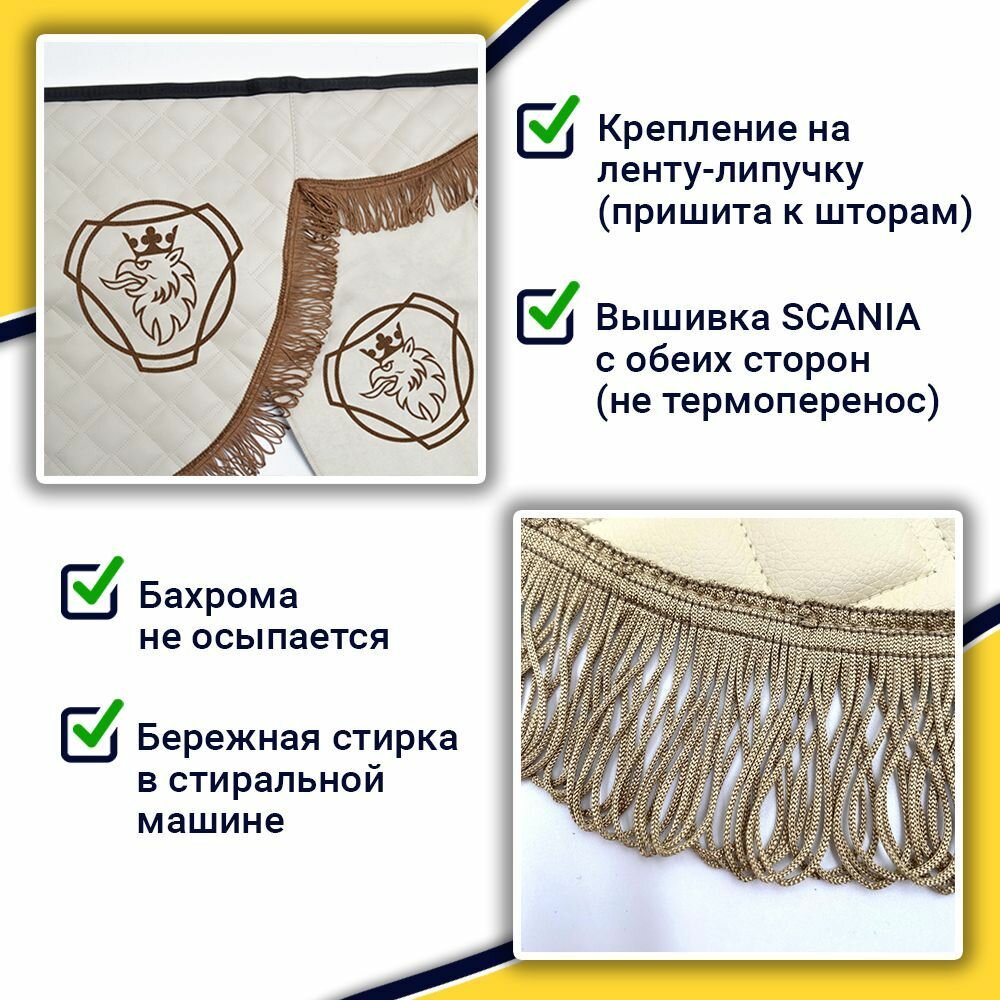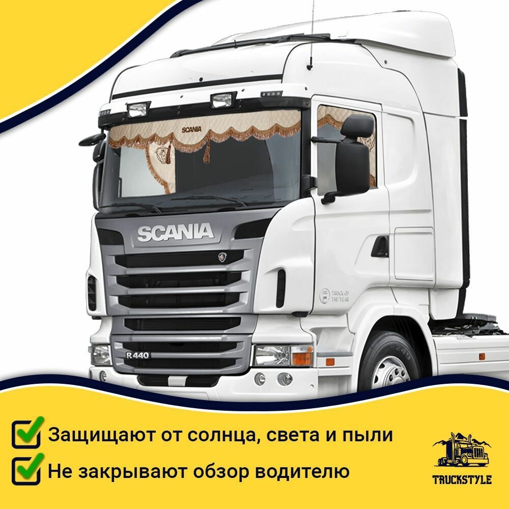 Купить Шторка автомобильная SCANIA для грузовиков. Комплект ламбрекен с косынками. Шторки солнцезащитные на лобое и боковые двери. Бежевый цвет с коричневыми кистями Truck Style с доставкой по всей России.