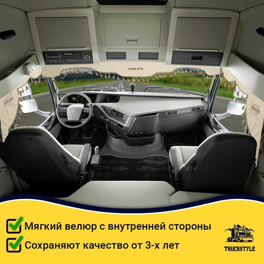 Купить Шторка автомобильная VOLVO для грузовиков. Комплект ламбрекен с косынками. Шторки солнцезащитные на лобое и боковые двери. Бежевый цвет с бежевыми кистями Truck Style с доставкой по всей России.