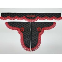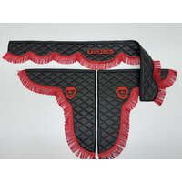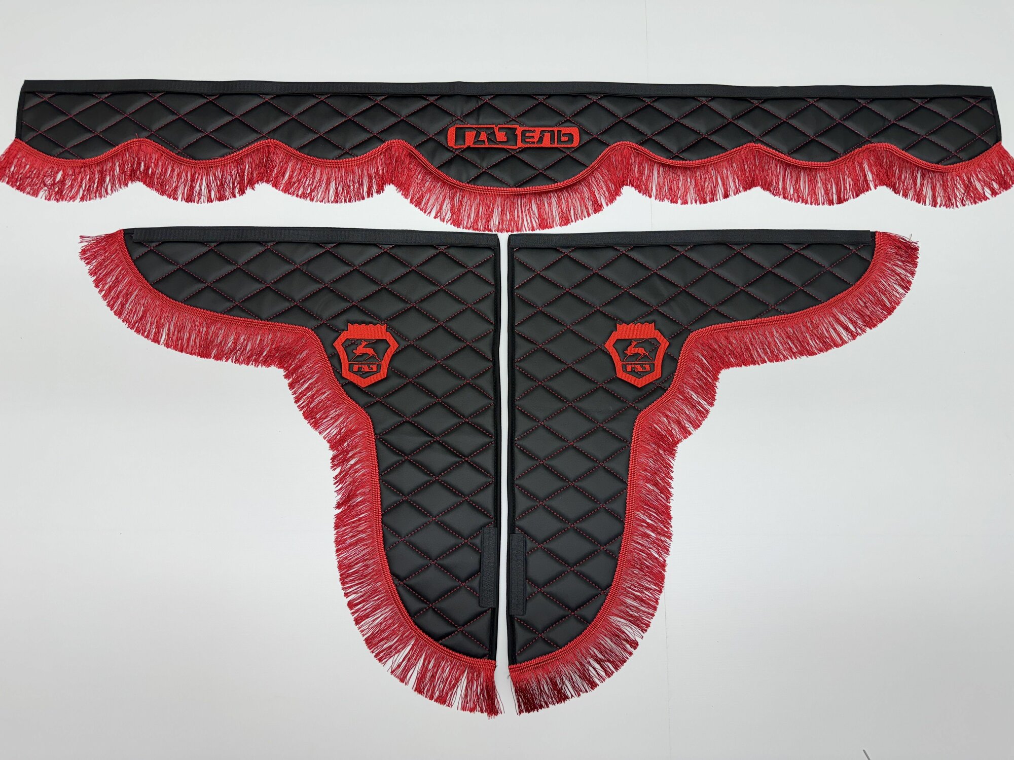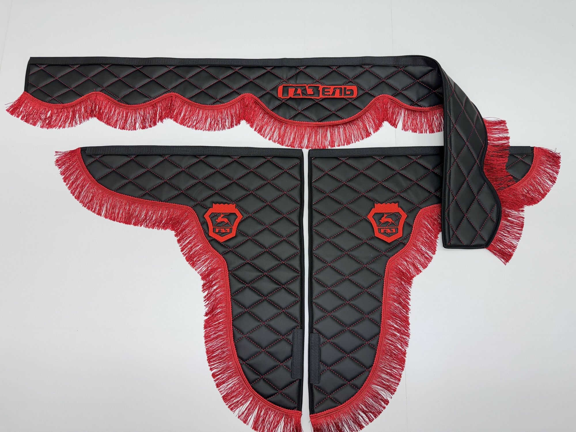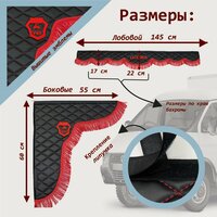 Данный комплект изготовлен из двух слоев черной экокожи и поролона. Ромбики прошиты вручную красной ниткой. Пришиты красные ниточки. Для крепления пришита липучка. Комплектация: ламбрекен на лобовое стекло 145 см и 2 боковых ламбрекена 55х60 см