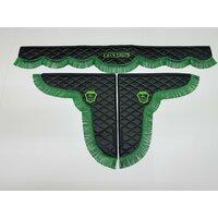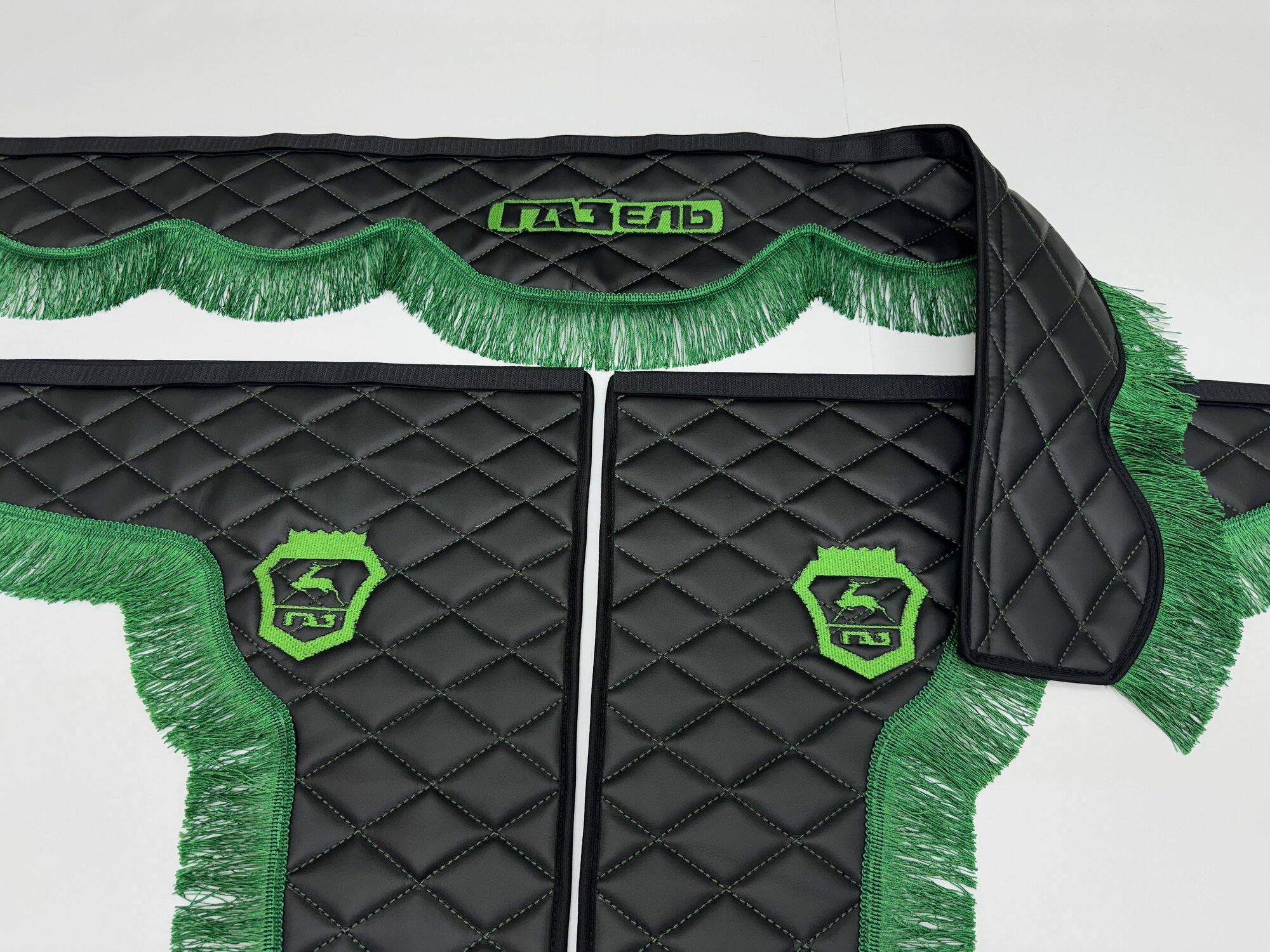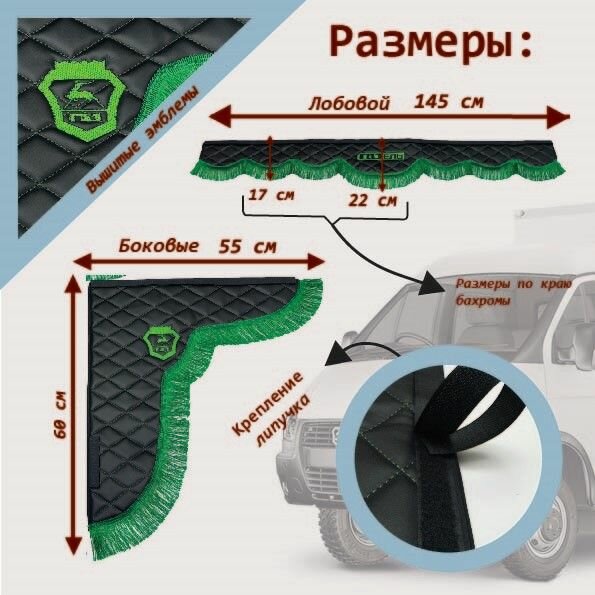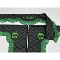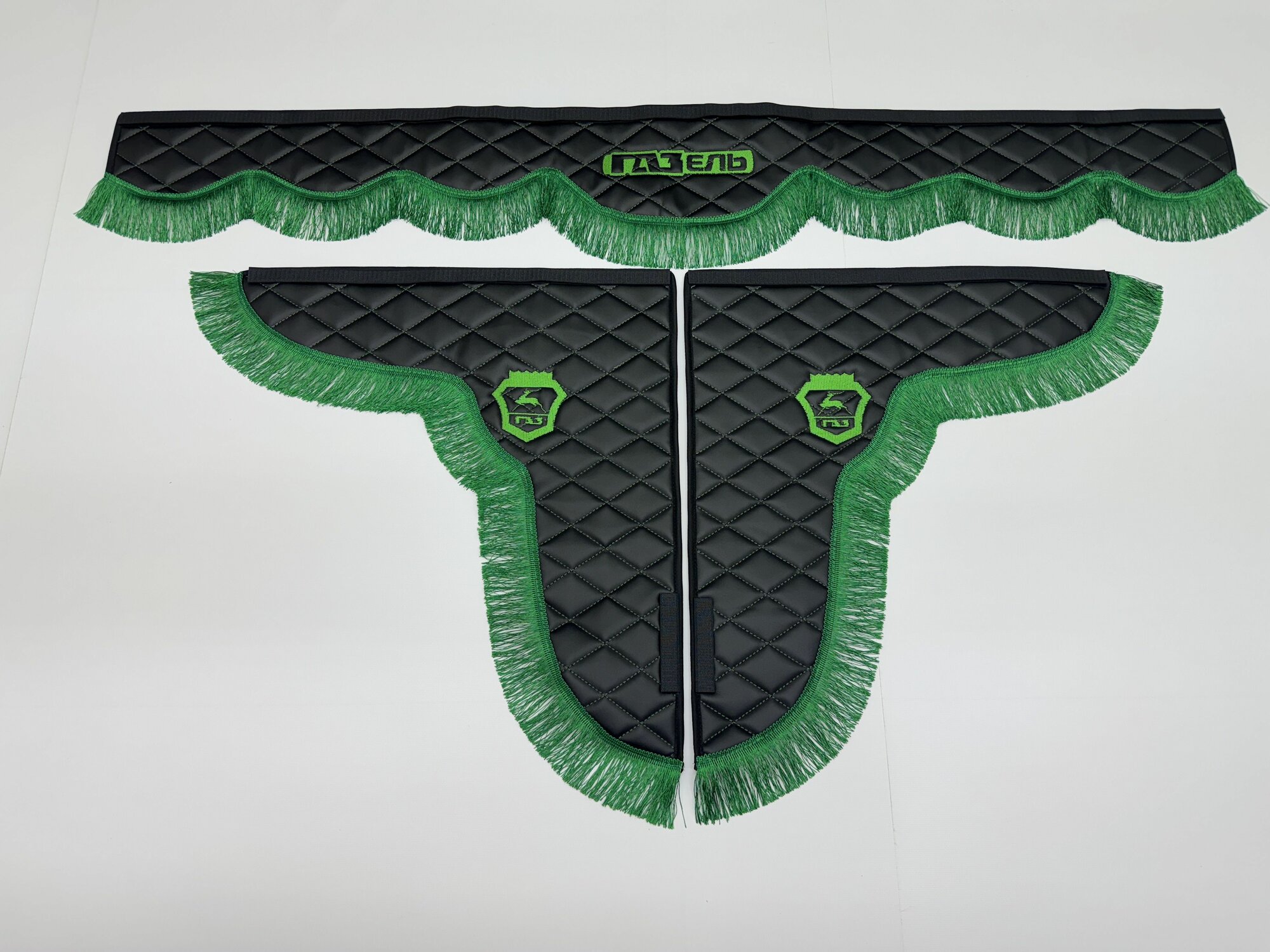 Данный комплект изготовлен из двух слоев черной экокожи и поролона. Ромбики прошиты вручную зеленой ниткой. Пришиты зеленые ниточки. Для крепления пришита липучка. Комплектация: ламбрекен на лобовое стекло 145 см и 2 боковых ламбрекена 55х60 см