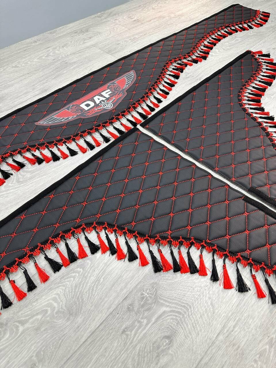 Купить Ламбрекены на грузовик в кабину авто из экокожи DAF (Черный с красной строчкой) с доставкой по всей России.