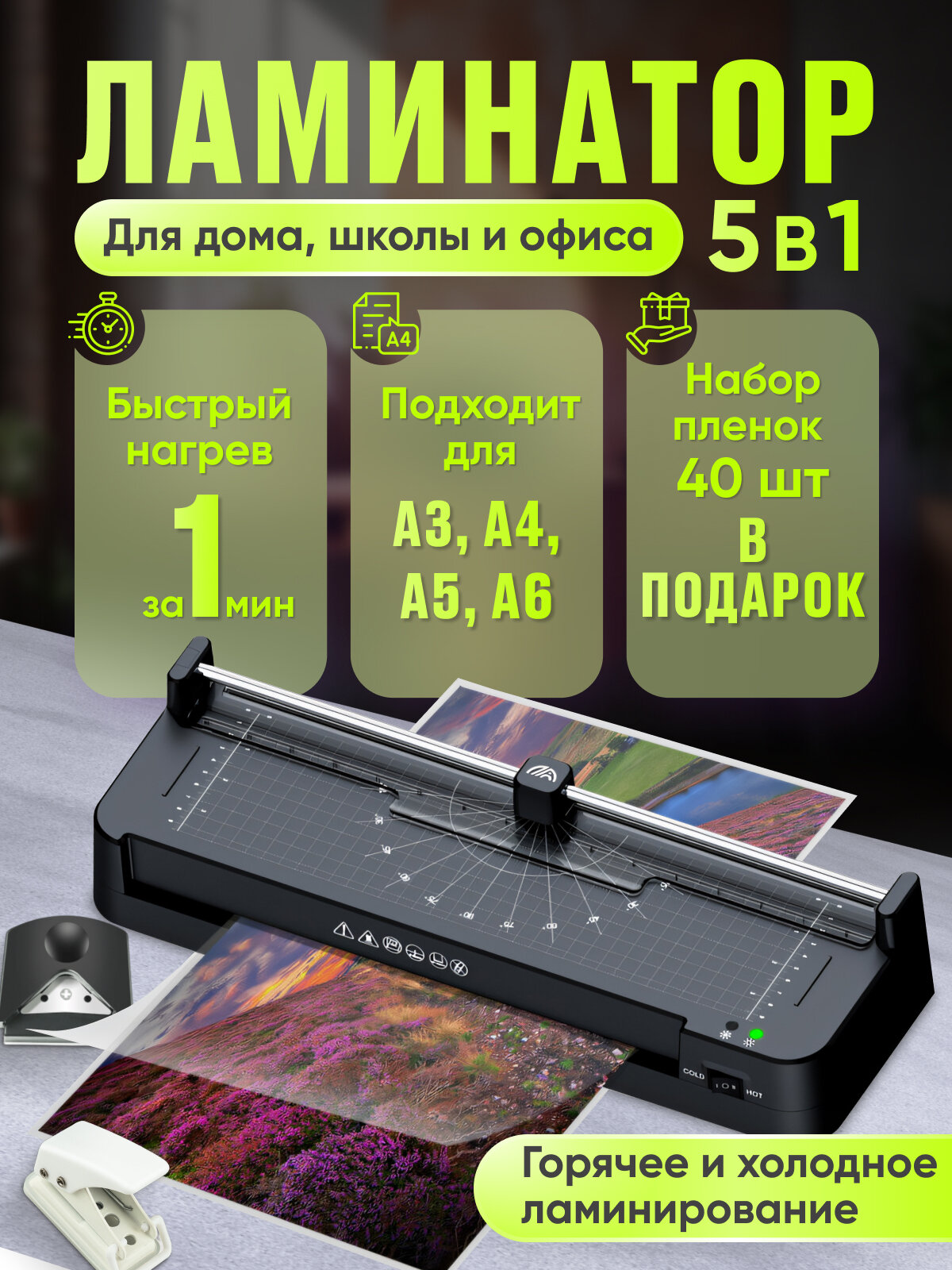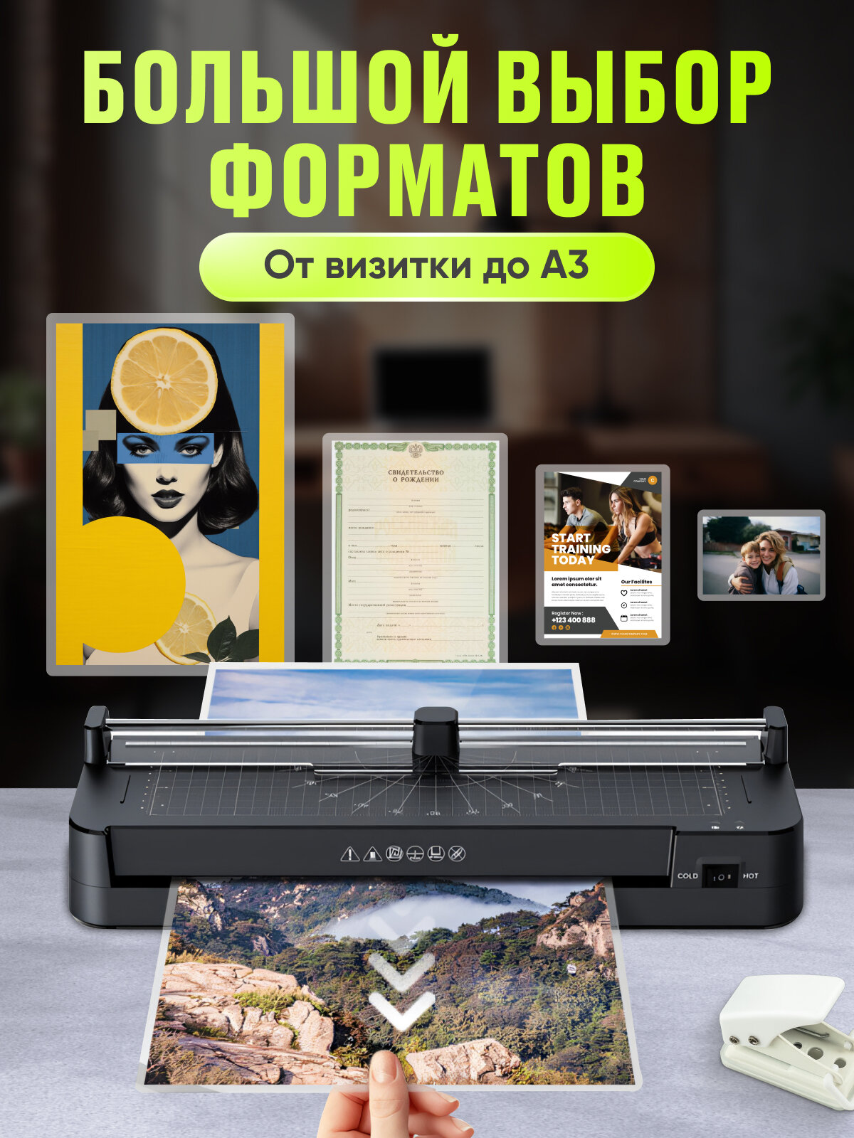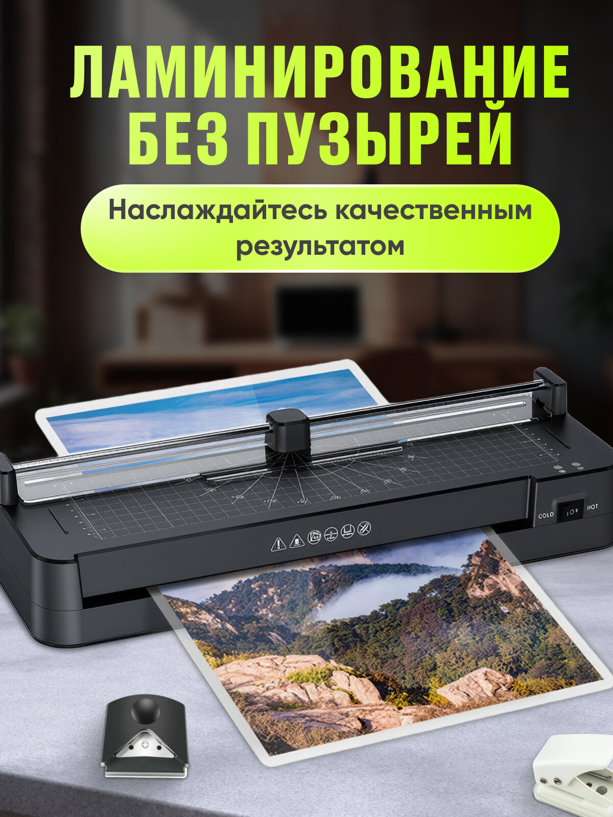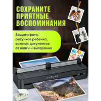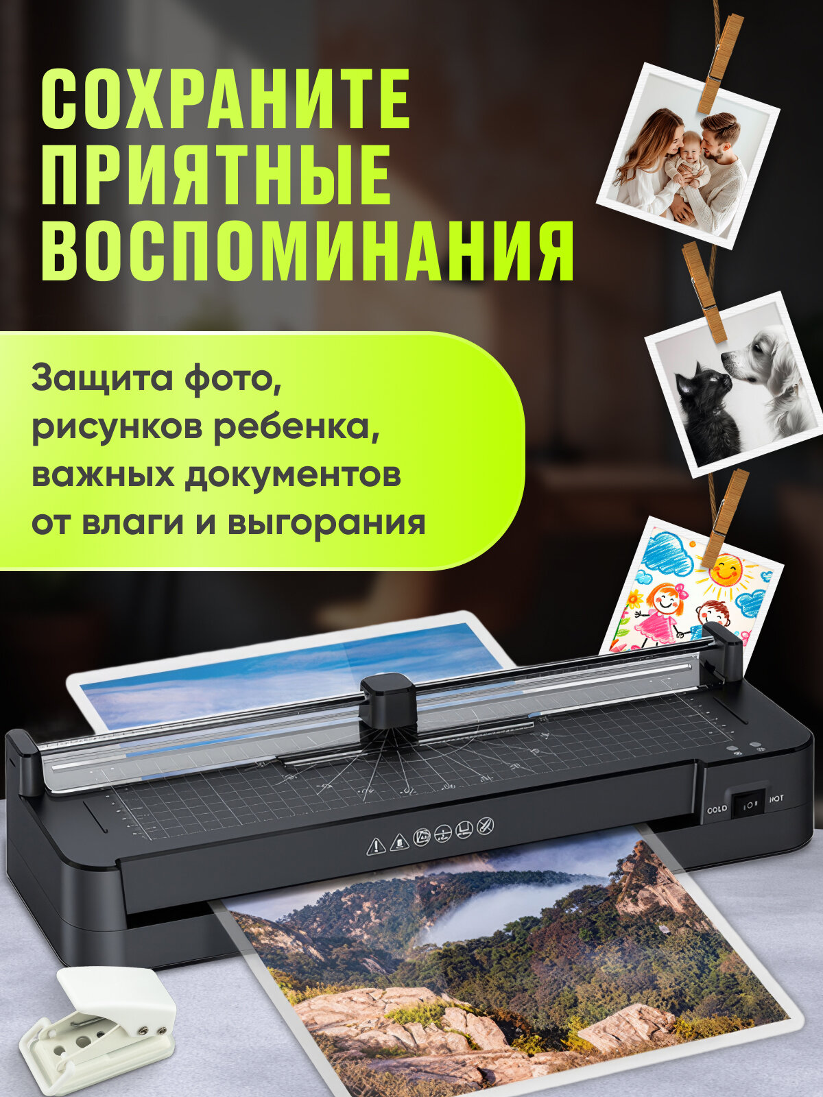 На устройстве установлены удобная линейка, обрезчик Вы получаете в подарок! Пластик не потрескается со временем, не выгорит и не обесцветит Ваши любимые фото или важные документы. Ламинатор легко справится с А 3, А 4, А 5, А 6, подойдет также для визиток и близких сердцу фотографий.