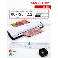 Формат: А3. Тип: пакетный. Ширина входящего документа, мм: 330. Количество валов (горячих): 2. Ламинатор пакетный LM-336 (А3). Ламинатор LM-336 – офисный прибор, использующий в работе систему горячих валов с внешним нагревом. Предназначен прибор для ламинирования меню, объявлений, пропусков, указателей, бэйджей и прочей печатной продукции. Это идеальная модель для организаций и офисов с небольшим объемом документооборота. Ламинатор мощностью 400 Вт производит ламинацию бумаг двумя способами – холодным и горячим. Скорость ламинирования в любом случае остается неизменной – 400 мм/мин. LM-336 – ламинатор, который поддерживает формат А3, что позволяет использовать его для защитного ламинирования различных документов – проездных, справок и прочих бумаг. Максимальная толщина ламинирования составляет 125 мкм, при этом толщина самого документа достигает 0.5 мм. Модель предусматривает наличие световых индикаторов питания и готовности к работе. Подготовка прибора к работе, то есть его нагрев, происходит в течение 1.5 минуты. Управлять устройством вы сможете в ручную, что позволит обеспечить полный контроль над процессом. В случае замятия головки следует нажать на рычаг, отключающий вращение валов.