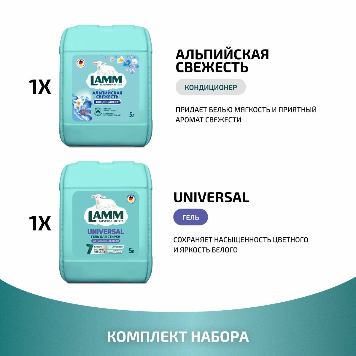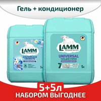 В набор входят гель для стирки белья LAMM Universal 5л и кондиционер для белья LAMM Альпийская свежесть 5л.