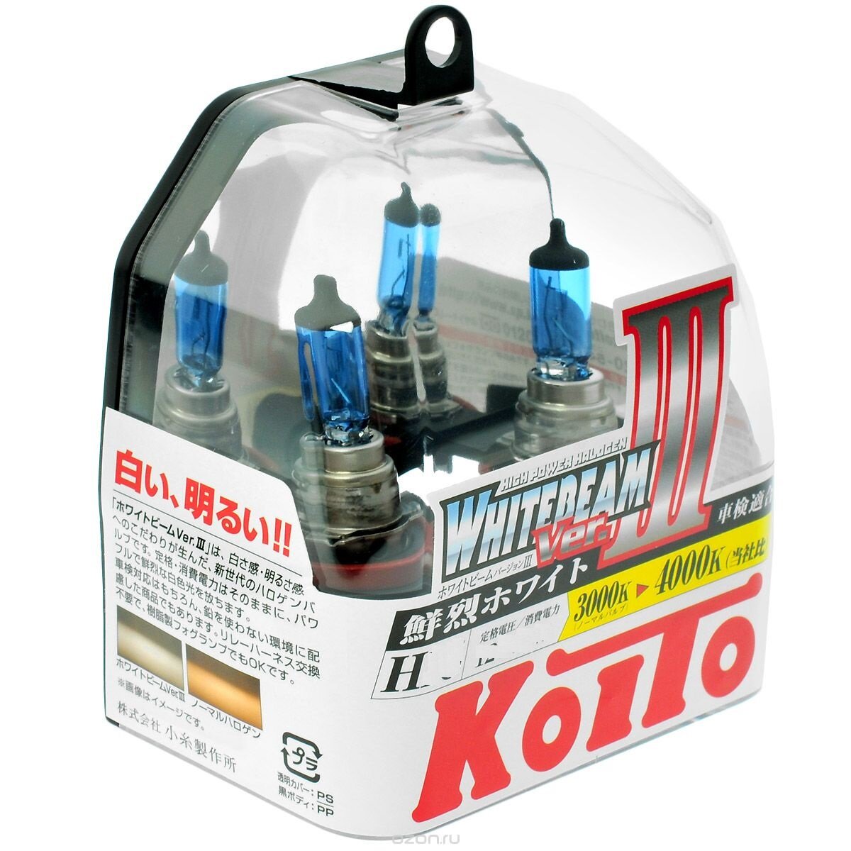 Если Вы хотите увеличить яркость света фар Вашего автомобиля - лампы KOITO Whitebeam будут лучшим выбором! Лампы KOITO Whitebeam являются вершиной развития технологий автомобильного освещения. Созданные с применением самых современных технологий и ноу-хау компании KOITO, разработанные на основе опыта поставок систем освещения крупнейшим мировым автопроизводителям, лампы серии Whitebeam III воплотили в себе весь опыт и достижения компании за почти вековую историю работы. Удвоенная яркость и отличная освещенность дороги обеспечивается за счет применения нескольких технологий: Температура свечения нити накаливания, выполненная из материала с повышенной тугоплавкостью, выше, чем в стандартных галогеновых лампах. Смесь инертных газов, специально закаченных в колбу под давлением, в два раза превышающим таковое в обычной лампе. Как результат, удвоенная яркость и улучшенная освещенность дороги! В современных автомобилях замена ламп часто является сложной задачей, для решения которой Вам понадобится ехать на СТО, тратить время и деньги. Лампы KOITO Whitebeam помогут Вам сэкономить, установив их один раз, Вы надолго обеспечите отличное «зрение» Вашему автомобилю! Лампы KOITO Whitebeam произведены на заводе компании KOITO в Японии и отвечают требованиям к качеству продукции, поставляемой на конвейеры. Срок службы лампы соответствует спецификациям производителей автомобилей, т. е. лампы KOITO Whitebeam прослужат на 25-100% дольше, чем похожие продукты других производителей Лампы KOITO Whitebeam III обеспечат на 50% более яркий и белый свет Ваших фар, чем стандартные лампы. За счет уникальной технологии нанесения покрытия на колбу, свет ламп серии Whitebeam составляет 4000-4200К, как у стандартной ксеноновой лампы, гарантируя Вам не только стильный вид фар Вашего автомобиля, но и отличную освещенность в любую погоду. Часто, пытаясь увеличить яркость света фар автомобиля, автовладельцы выбирают лампы увеличенной мощности. Такие лампы не предназначены для использования в стандартных фарах, и результатом их использование становится оплавившейся и помутневший пластик фар, а часто и выход из строя фары. Лампы KOITO Whitebeam разработаны для применения в любых фарах, они не выделяют избыточного тепла и имеют стандартное энергопотребление. Колбы ламп Whitebeam , изготовлены из стекла - более тугоплавкого, чем обычное, и фильтрующего УФ-часть излучения. Это уменьшает выделение тепла в фаре и позволяет использовать эти лампы не опасаясь за сохранность оптики. Электрическая мощность лампы стандартная (60/55 Вт для Н4), нет дополнительной нагрузки на электрическую систему автомобиля. Свет фар с установленными лампами KOITO Whitebeam III не будет ослеплять встречных и попутных водителей. Значение освещенности ламп укладывается в требования госта и не будут слепить впереди едущего водителя: при требовании к освещенности менее 0,7 лм, освещенность у KOITO Whitebeam III не превышает 0,61 лм. Лампа KOITO Whitebeam III хорошо освещает зону ближней обочины (15,9 лм при требовании для серийной продукции 9,6 лм), и также неплохо освещается зона дальней обочины. Применение ксеноновых ламп разрешено только в фарах специально разработанных для таких ламп и имеющих соответствующую маркировку. С лампами KOITO Whitebeam III Вы получите яркий белый свет фар Вашего автомобиля, аналогичный свету ксеноновой лампы, установив их в любую стандартную фару. Световой потом 