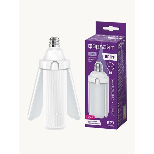Новинка! Светодиодная лампа-трансформер Т80-4 60Вт 6500К Е27 Фарлайт с четырьмя лопастями. LED-трансформер идеально подойдёт для офисных, складских и подвальных помещений, лофтов, а также освещения гаражей и придомовых территорий. Лампа излучает яркий холодный белый свет, который делает пространство визуально свободнее. Легкий монтаж, отличные светотехнические характеристики, энергоэффективность и оригинальный дизайн позволят вам создать комфортную рабочую среду. Управляйте светом и формой по своему желанию, прочная конструкция светильника выдержит любую трансформацию. В сложенном состоянии в виде лампы она обеспечивает мягкий свет с углом рассеивания в 360°. Отклоните лопасти до упора – и у вас оригинальный светильник в форме вентилятора. Поверните лепестки светящейся стороной в направлении потолка, и вы получите мягкий, равномерный световой поток. Хотите светильник-цветок – согните лопасти под углом 45°. Несколько вариантов светильников – в одной модели Т80-4 60Вт 6500К Е27 Фарлайт. Размер лампы в разложенном состоянии 342 мм, высота 234 мм. Срок службы 30000 часов.