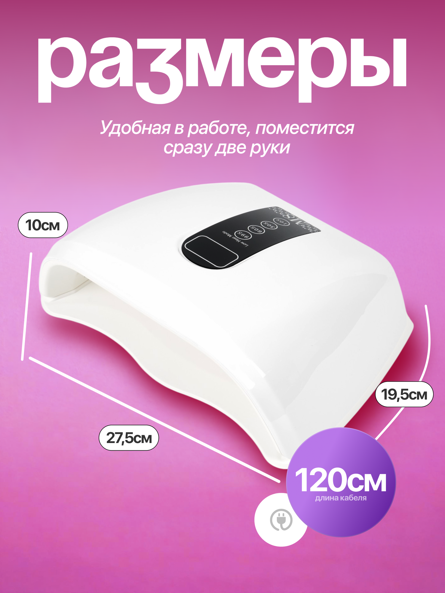 Благодаря простоте и автоматизации такую сушилку для ногтей можно легко использовать дома . Этот бытовой прибор сделает ваши ручки красивыми и ухоженными. Оборудована датчиком движения. Загорается, когда рука внутри и гаснет, когда снаружи. Режим низкого нагрева не вызывает жжения и подходит при работе с акрилом и чувствительными ногтями. Размер позволяет сушить несколько пальцев одновременно. В лампах мини, процесс занимает гораздо больше времени. Длина шнура 1,2 метра. Гарантия.