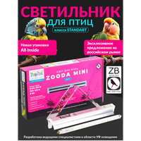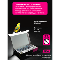Светильник для птиц ZOODA MINI KIT GENARATION 2. Наша компания специализируется на изготовлении и создании УФ освещения для всей декоративной птицы. Данный комплект для птиц вобрал в себя всё самое современное в области ультрафиолетового освещения для птиц: надежная электроника, высокоэффективный отражатель, лаконичный дизайн и удобное крепление. Покупая комплект для птиц ZOODA MINI KIT, вы можете быть уверенным, что ваша птица в полной безопасности и получает требуемый уровень УФ излучения полезных длин волн УФ-А и УФ-В. Данный комплект и лампа для птиц отлично подойдет для освещения всей мелкой декоративной птицы: волнистые попугаи, канарейки, семейство вьюрковых, попугаи неразлучники, декоративные голуби, другие мелкие птицы и попугаи. Светильник изготовлен из специального легкого алюминия, поэтому имеет незначительный вес, но при этом он сохраняет прочность. Форма отражателя помогает четко направлять свет и увеличивать КПД на 85%. Для того, чтобы закрепить светильник на клетку сбоку или сзади, в комплекте имеется фирменный кронштейн ZooDA Bracket. Установка занимает 5 минут и не требует особых навыков. Изменения, которые коснулись второго поколения: 1. Более качественный и дорогой материал светильника 2. Боковая заглушка для дополнительной безопасности 3. Измененная форма отражателя (немного увеличился угол рассеивания) 4. Новая удобная упаковка All Inside