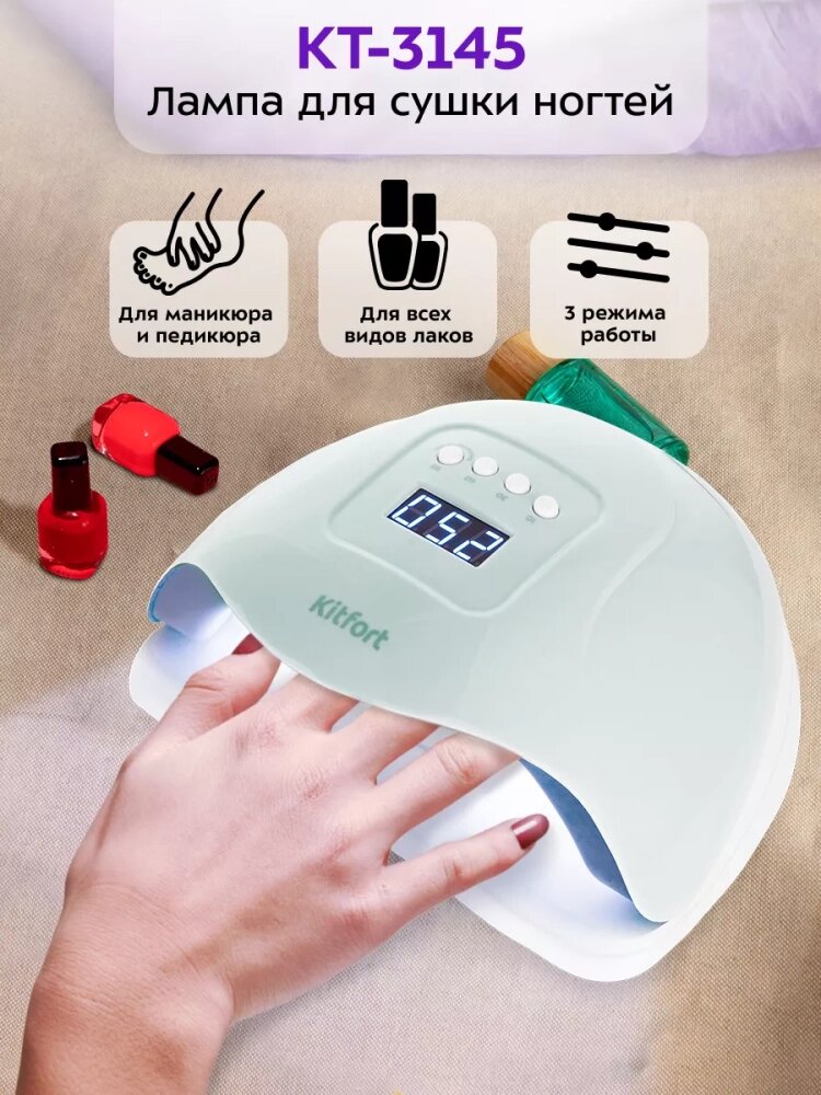 Лампа для сушки ногтей Kitfort КТ-3145 предназначена для полимеризации лакового покрытия. Гибридный двойной свет LED + UV полимеризует любые покрытия: гель-лаки, УФ-гели, биогели, шелаки, гель-краски, 3D-гели и другие.