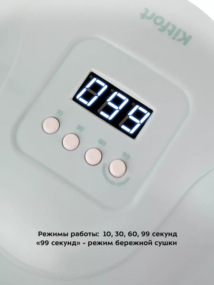 Сверху на лампе находится панель управления и дисплей, где отображается время работы. Вы можете настроить таймер на 10, 30, 60 и 99 секунд. При выборе «99» включается режим бережной сушки, который предотвращает дискомфорт и жжение при полимеризации гелей.