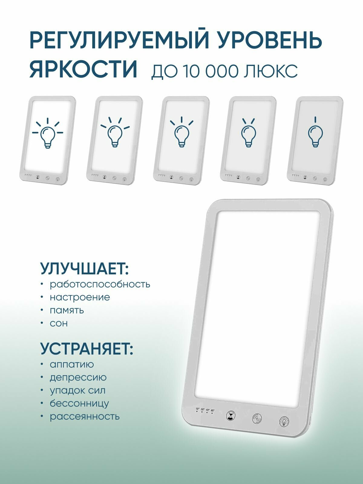 Регулируемое количество света до 10 000 Люкс. Регулируемая температура света 3000-6500 К. Таймер 15-30-45-60 мин.
