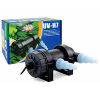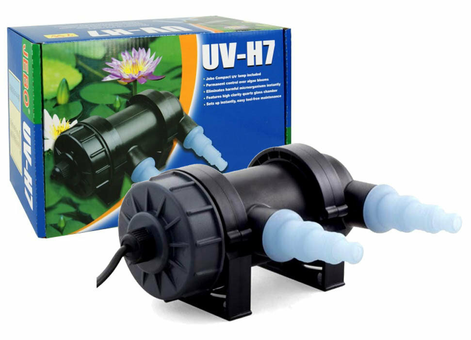 Jebo UV-H7 — проточный УФ-стерилизатор для аквариума или системы морских и пресноводных аквариумов. Убивает плавающие водоросли, деактивирует бактерии и возбудителей болезней, снижает риск инфекций рыб и помогает добиться чистой воды. Очистка производится при помощи ультрафиолетового С-излучения. Специальная лампа внутри прибора излучает ультрафиолет. UVC — излучение в достаточной дозе убивает облучаемые водоросли, бактерии, простейших и других возбудителей заболеваний. Использование стерилизатора делает воду прозрачнее, что выгодно отражается на внешнем виде аквариума. Наш опыт использования УФ-стерилизаторов помогает правильно подобрать нужный стерилизатор, мы советуем вам не останавливать свой выбор на моделях с пограничной производительностью и мощностью: чем мощнее УФ-излучение и чем медленнее поток через колбу стерилизатора — тем больше шансов добиться нужного результата. При использовании в морском аквариуме стерилизатор должен быть примерно в два раза мощнее, чем для пресноводного аквариума того же объёма.