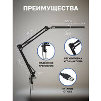 Лампа LED бестеневая светодиодная на струбцине работает от USB, что делает ее удобной для использования в любом месте. Вам не придется искать розетку или беспокоиться о длине провода.