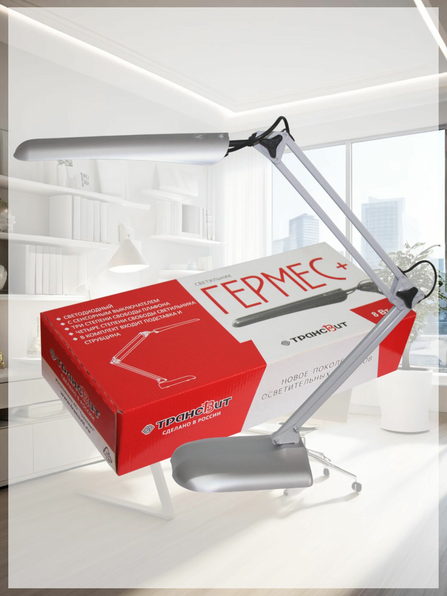 Лампа настольная Гермес+ офисная для рабочего стола на пантографе, светодиодная, сенсорная, без диммирования, LED 8 Вт, серебристый, Трансвит: сравнение цен, характеристики, фото, актуальное наличие и цены.