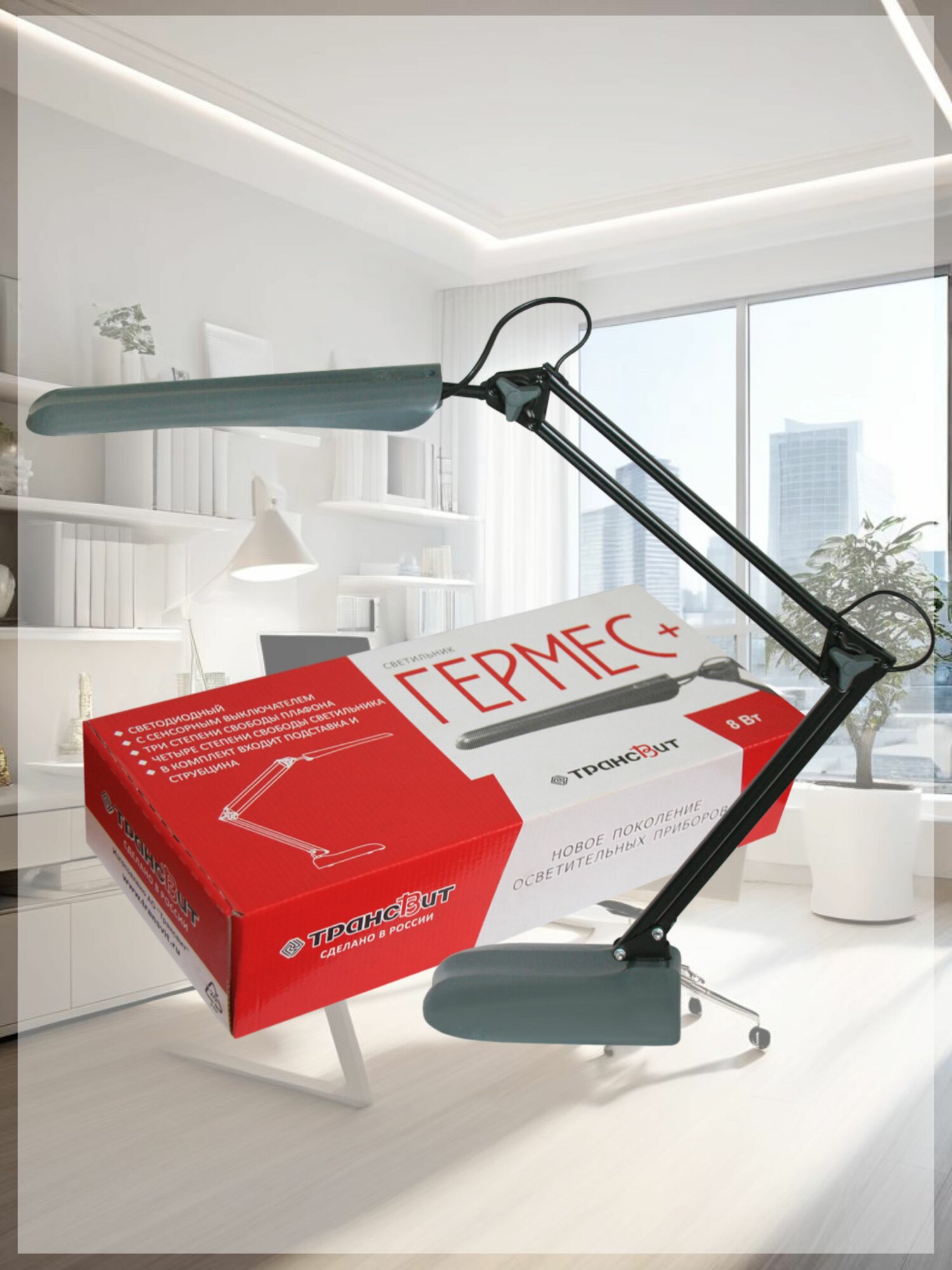 Лампа настольная Гермес+ офисная для рабочего стола на пантографе, светодиодная, сенсорная, без диммирования, LED 8 Вт, темно-серый, Трансвит: сравнение цен, характеристики, фото, актуальное наличие и цены.