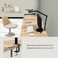 Лампа крепится на струбцине, что обеспечивает надежное и устойчивое положение на столе. Ширина лампы составляет 105,4 см, а вес - всего 2,67 кг, что делает ее легкой и компактной. Особенностью данной модели является возможность регулировки по высоте и цветовой температуры. Это позволяет настроить освещение в соответствии с вашими предпочтениями и потребностями.