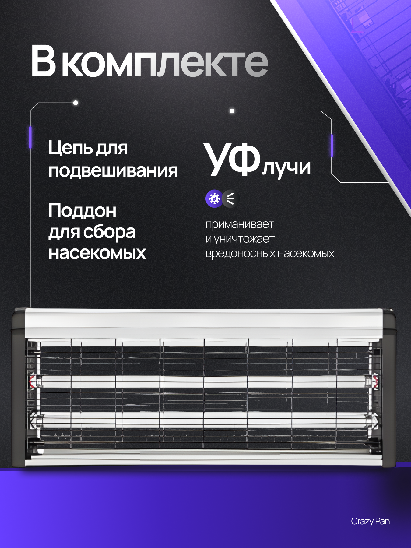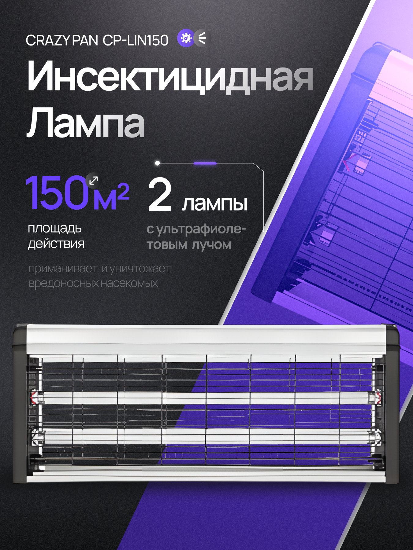 Купить Лампа от комаров и насекомых Сrazy Pan CP-LIN150 ультрафиолетовая, 40Вт, площадь 150 м2, 220 В, цепь для подвешивания с доставкой по всей России.