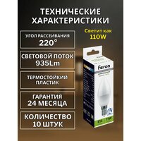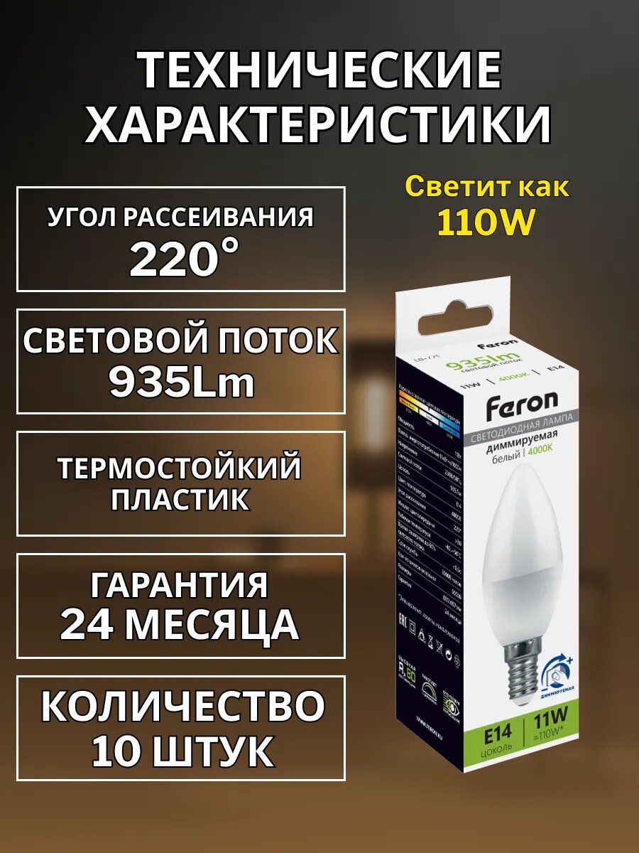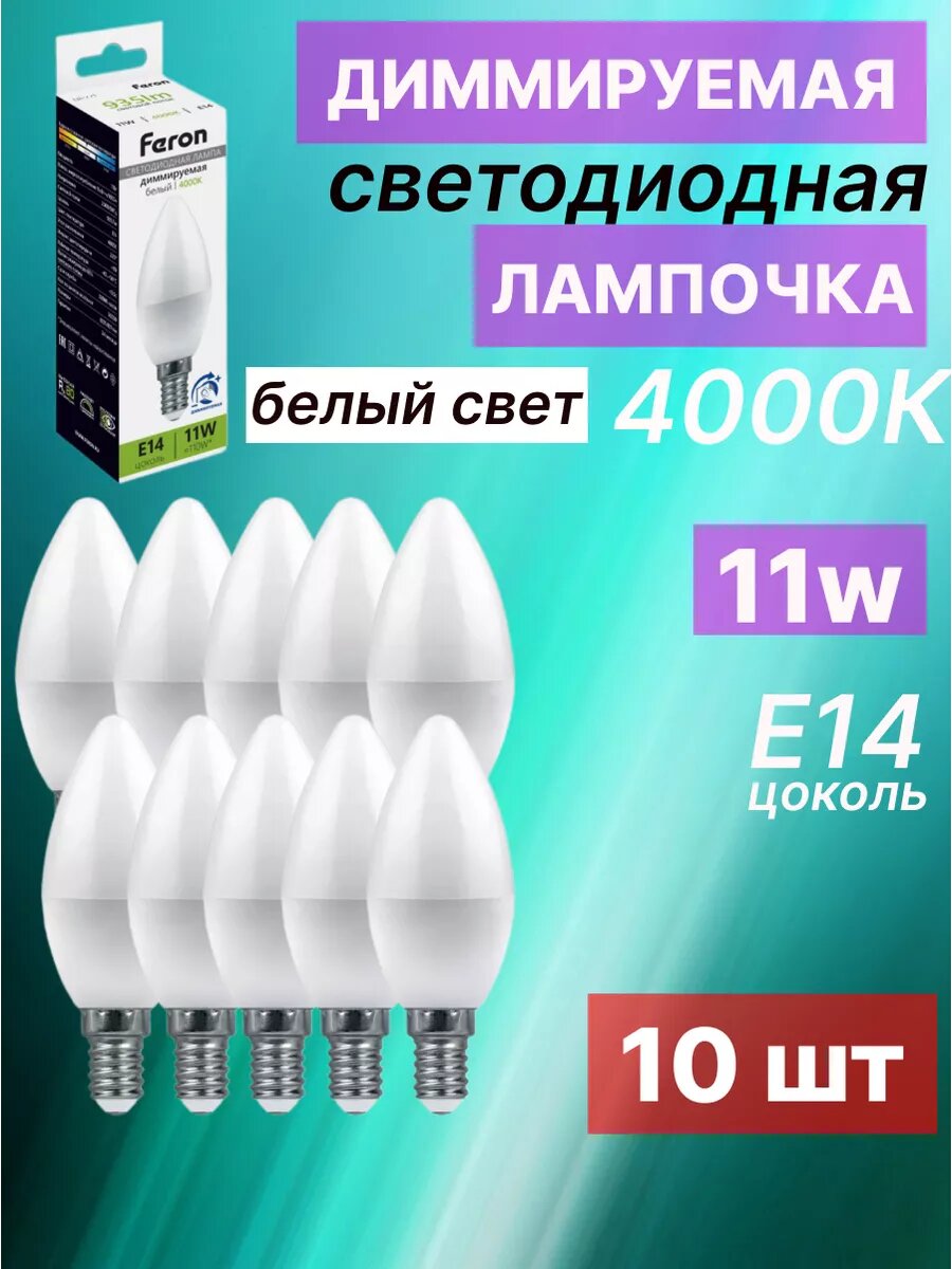 Лампа светодиодная диммируемая свеча представляет собой источник света высокой эффективности и надежности. Её потребляемая мощность составляет 11 Вт, а рабочее напряжение - 230 В переменного тока. Светодиодная лампа шар оснащена цоколем E14, что позволяет её легко установить в большинство стандартных осветительных приборов. Цветовая температура лампочки E14 светодиодной составляет 4000К, что соответствует белому свету. Это обеспечивает стабильный световой поток с высокой цветопередачей, что особенно полезно в рабочих помещениях или там, где требуется точное воспроизведение цветов. Светодиодная лампочка свеча имеет матовый белый рассеиватель, который создает равномерное рассеивание света. Световой поток составляет 935 лм, что гарантирует яркое освещение и помогает сэкономить на энергозатратах. Это надежный и энергоэффективный выбор для освещения различных помещений, обеспечивая яркий свет с высоким качеством освещения. Мы рады предложить Вам обновить свое пространство с помощью простых в установке изделий. Желаем вам приятных покупок, друзья! Feron 51056 - 10 шт.
