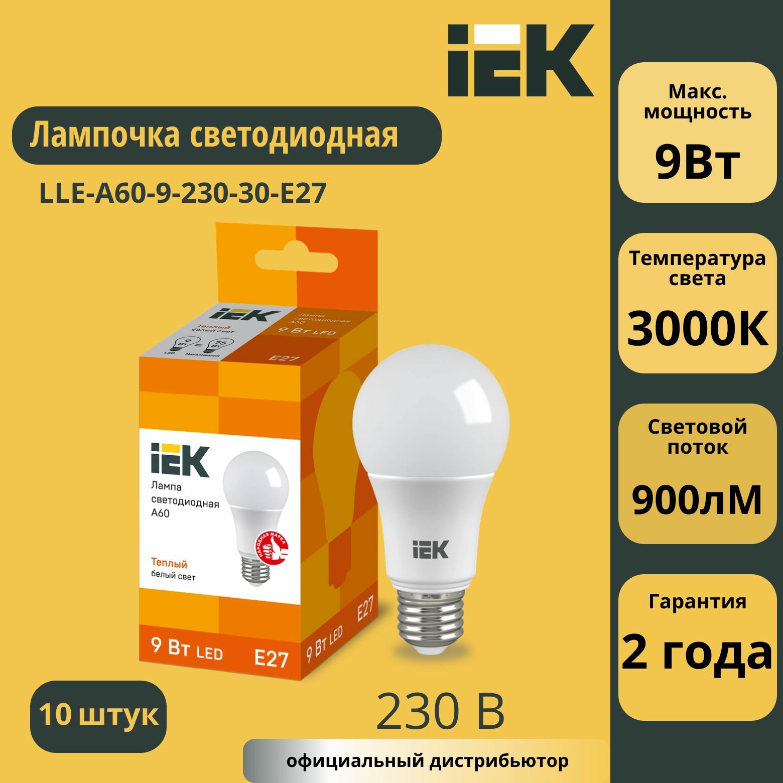 IEK Лампа светодиодная Eco 9Вт A70 грушевидная 3000К E27 810лм 230-240В LLE-A60-9-230-30-E27 / тёплый белый, 10 штук: сравнение цен, характеристики, фото, актуальное наличие и цены.