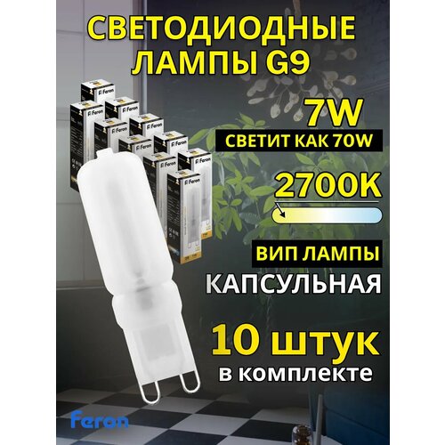 Продается в количестве 10 штук Светодиодная лампа капсульная Feron предназначена для замены галогенных ламп и использования во встраиваемых светильниках, спотах и люстрах с соответствующим патроном. Используется цоколь G9, применяемый в осветительных приборах для направленной подсветки. Радиальное расположение светодиодов обеспечивает равномерное распределение света, а матовый рассеиватель белого теплого цвета предотвращает ослепление, характерное для прямого излучения светодиодов. Мощность светодиодной лампочки всего 7 Вт, но за счет сильного светового потока 520 лм, она будет светить ярче вашей старой лампочки. Цветовая температура 2700К (белый теплый свет) изменит освещение вашего помещения и сделает его более комфортным для глаз. LED лампа светодиодная очень проста в установке и работает моментально. Долгий срок службы. Компактный размер. Мы рады предложить Вам обновить свое пространство с помощью простых в установке изделий. Желаем вам приятных покупок, друзья!