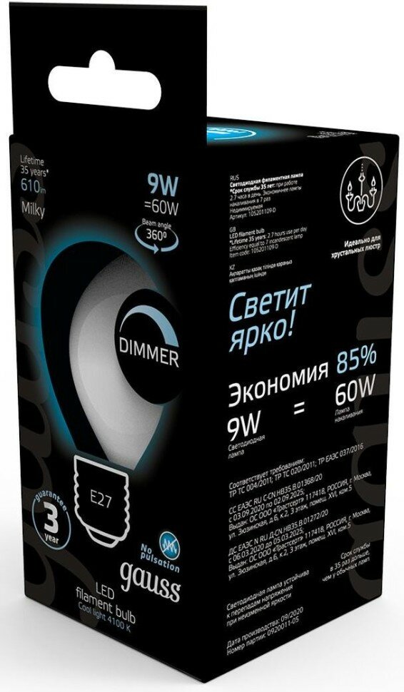Лампа светодиодная Gauss Filament 105202209-D 9Вт цок: E27 шар 220B 4100K св. свеч. бел. нейт. (упак:10шт): сравнение цен, характеристики, фото, актуальное наличие и цены.