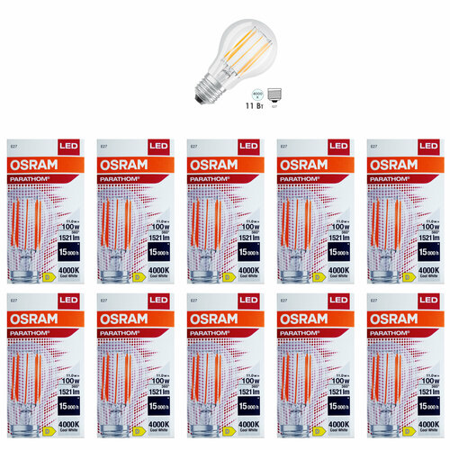Лампа филаментная светодиодная OSRAM Parathom A, 1521лм, 11Вт (замена 100 Вт), 4000К (нейтральный белый свет). Цоколь E27, колба A, угол пучка 300°. Исполнение колбы прозрачное, стекло.