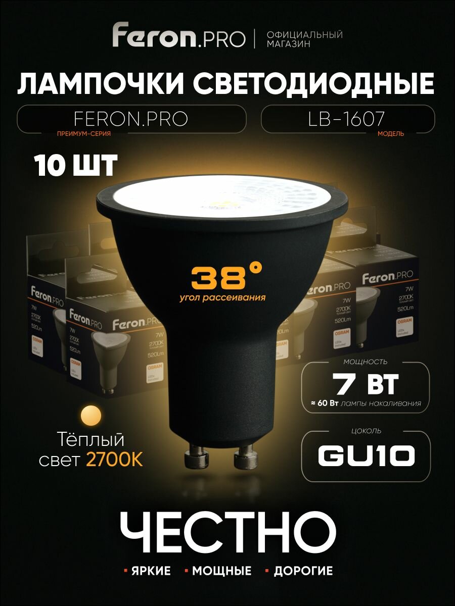 Лампа светодиодная GU10 7W MR16 рефлектор теплый белый свет 2700K Feron.PRO LB-1607 48954, упаковка 10 штук: сравнение цен, характеристики, фото, актуальное наличие и цены.