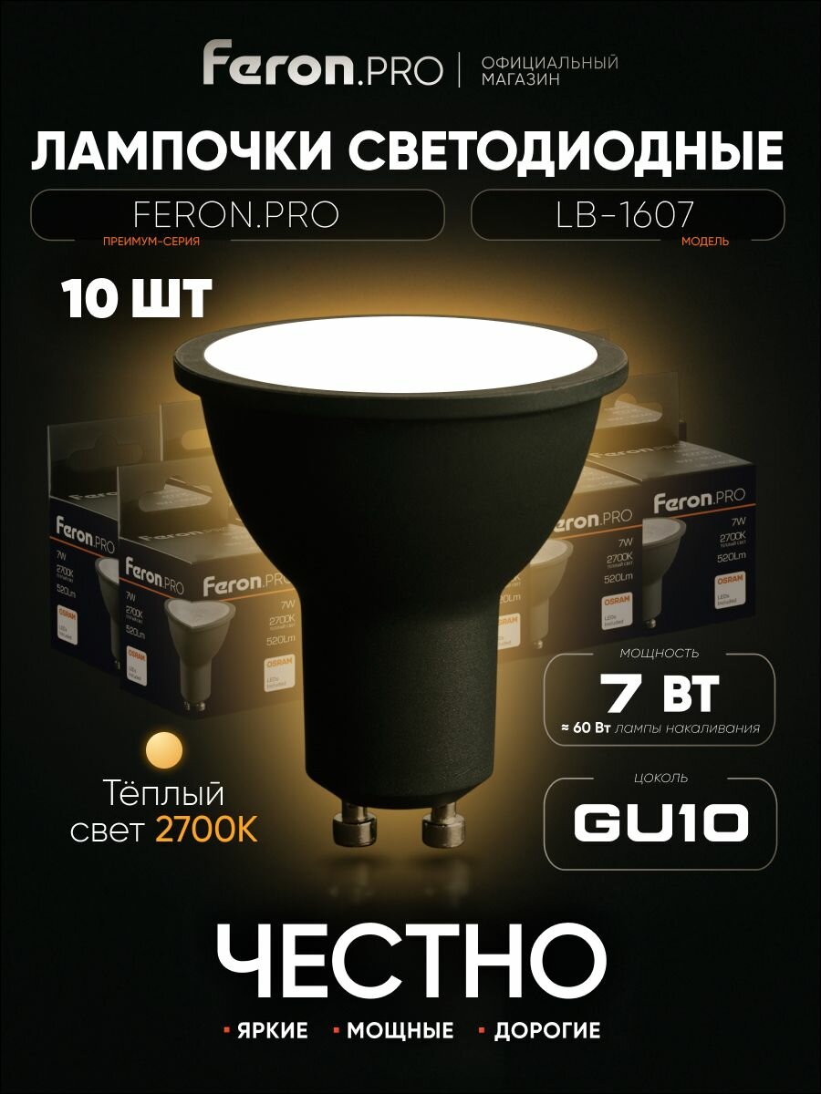 Лампа светодиодная GU10 7W MR16 рефлектор теплый белый свет 2700K Feron.PRO LB-1607 48956, упаковка 10 штук: сравнение цен, характеристики, фото, актуальное наличие и цены.