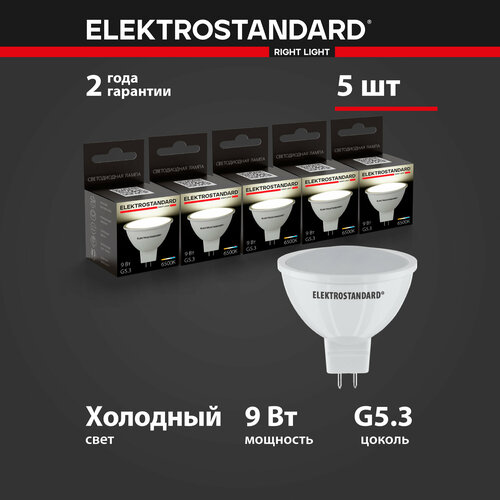 Светодиодная лампа Elektrostandard BLG5309 с цоколем G5.3 и размерами 52 мм по высоте и диаметром в 50 мм обладает мощностью в 9 Вт и цветовой температурой 6500 К, что соответствует холодному белому свету.
