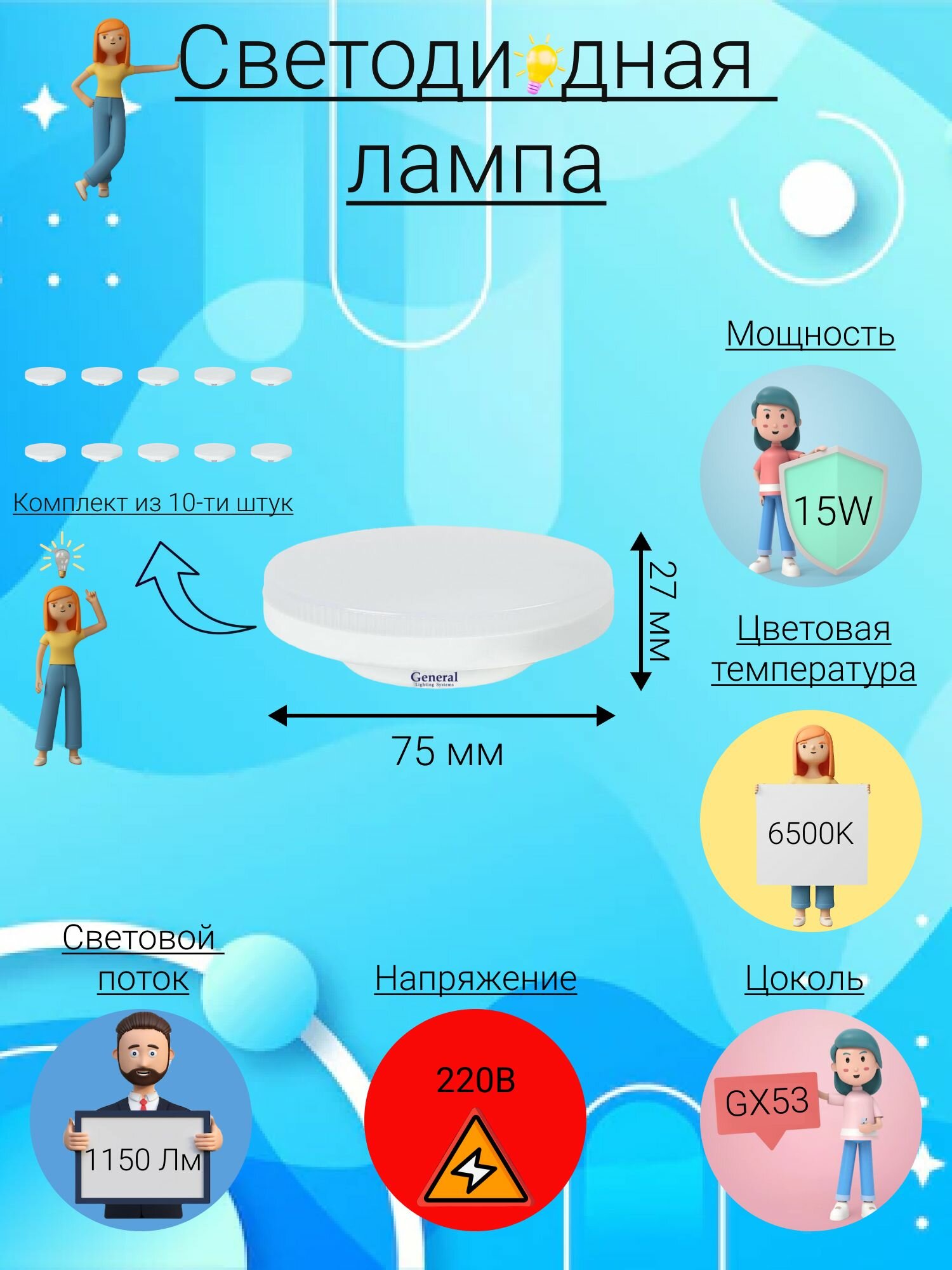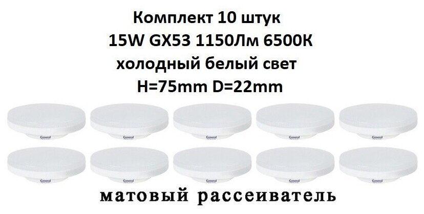 General, Лампа светодиодная, Комплект из 10 шт, 15 Вт, Цоколь GX53, 6500К, Форма лампы Шайба, GX53: сравнение цен, характеристики, фото, актуальное наличие и цены.