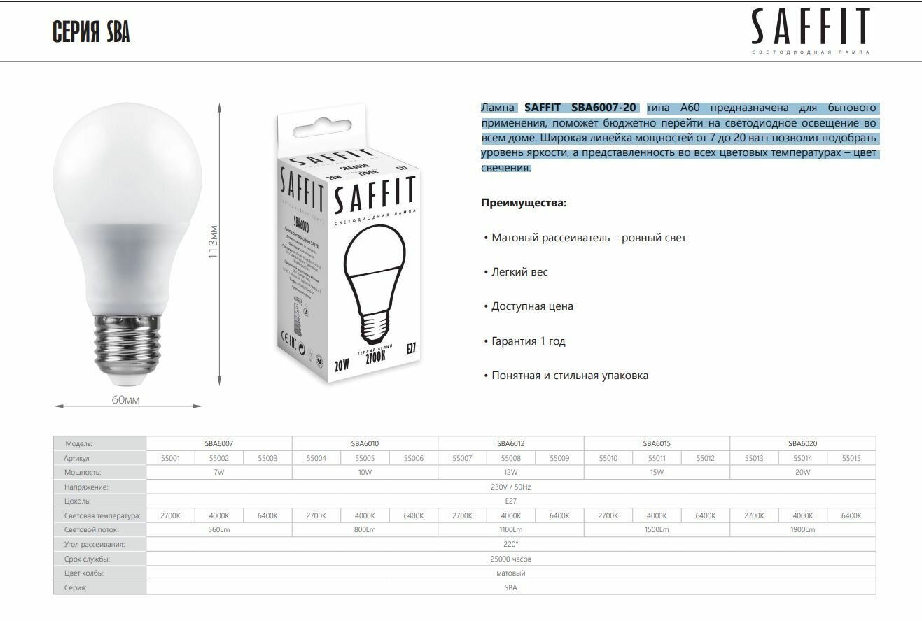 Лампа SAFFIT SBA6007-20 типа A60 артикул 55014 предназначена для бытового применения, поможет бюджетно перейти на светодиодное освещение во всем доме.
