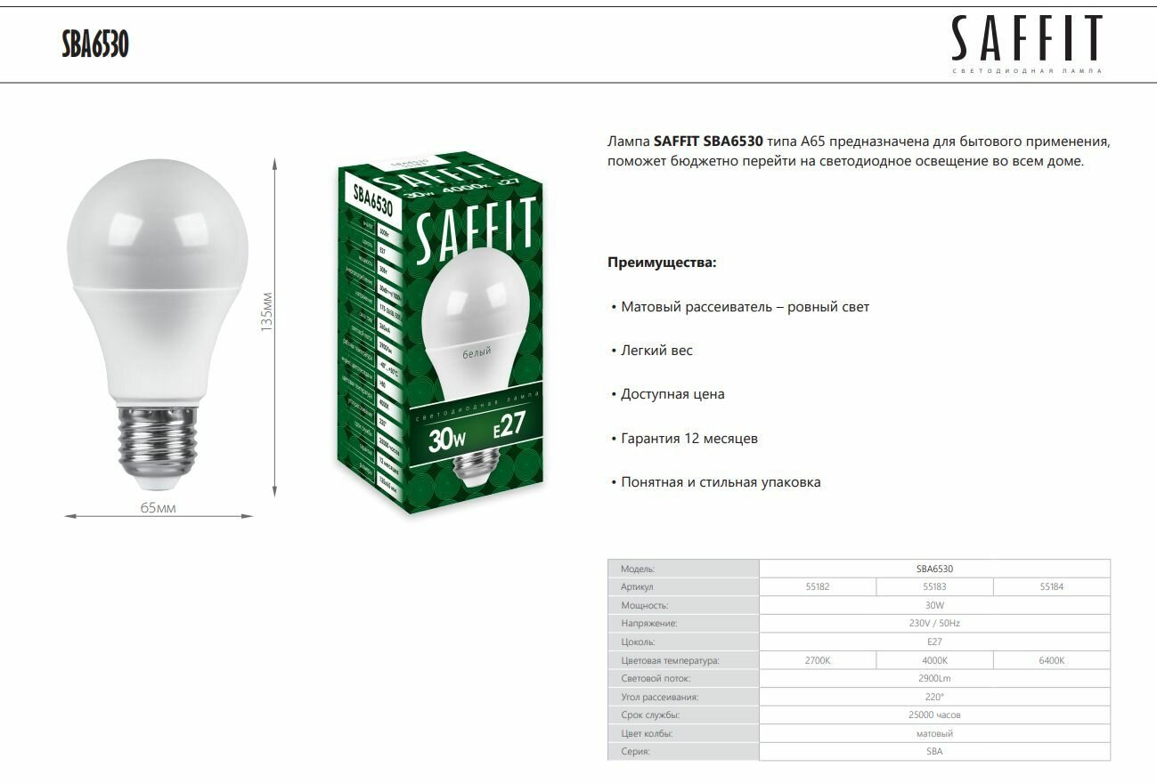 Лампа SAFFIT предназначена для бытового применения, поможет бюджетно перейти на светодиодное освещение во всем доме.